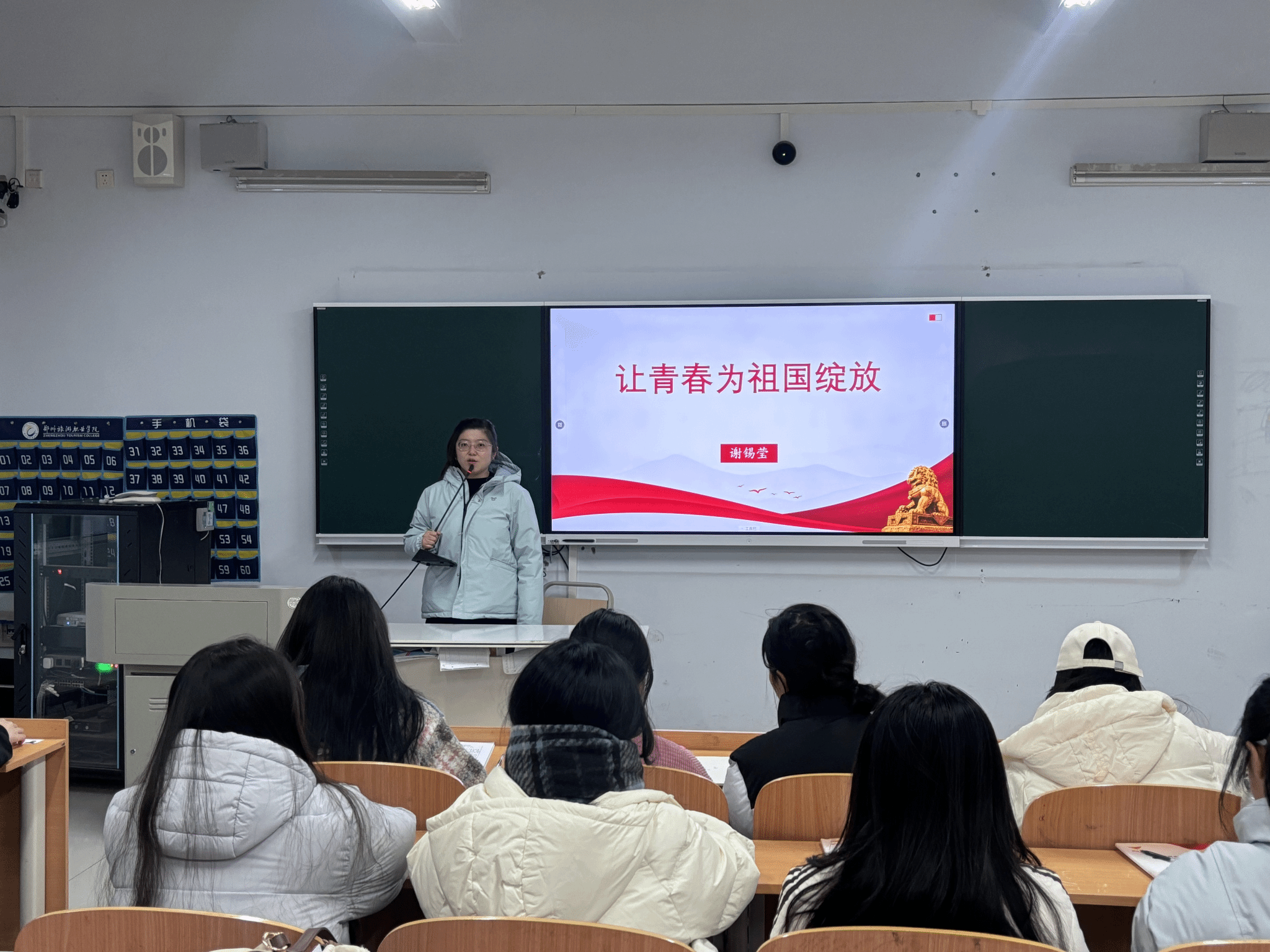 随后谢老师以“让青春为祖国绽放”为主题展开第一讲。首先她从青年与国家的关系切入,并结合革命先辈的英勇事迹和当代青年榜样的追梦故事,深刻阐释了青春的意义在于奉献、青春的价值在于担当。青年爱国,当筑牢理想信念,将个人所学融入国家发展,以实干担当在新时代赛道上贡献青春力量。谢老师还指出,我国正处在全面建设社会主义现代化国家时期,我国科技成果丰硕,航天事业领先全球,当代青年,应深耕专业知识,将个人所需融入国家发展,把自己的青春理想融入强国建设的浪潮中。谢老师的演讲深入人心,引发了学员们的共鸣。