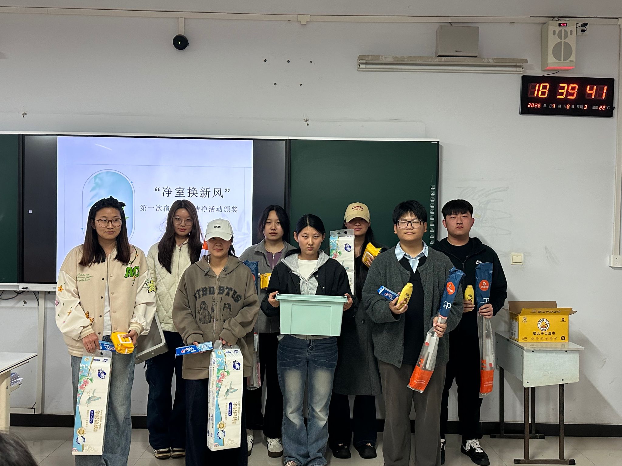 4月8日,为表彰先进、树立典范,学院对在本次“净室换新风”活动中表现优异的宿舍进行了集中表彰,并颁发奖品。