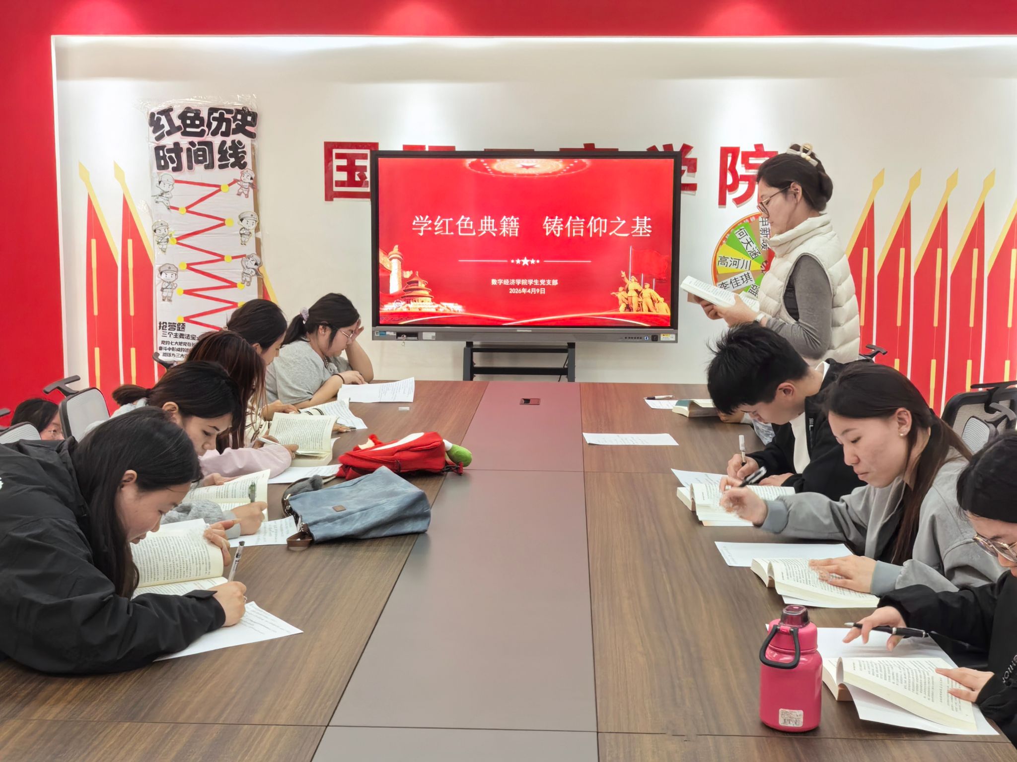 2026年4月14日,数字经济学院学生党支部在1B303党建活动室举办了“学红色典籍·铸信仰之基”读书分享系列活动。本次活动以《中国共产党简史》第一章为阅读主线,通过设置“转盘问答”、“时间线贴改”等互动环节,引导同学们在沉浸式体验中感悟信仰力量、传承红色基因。本次活动由党务助理隆亚龙同学主持,2025年度入党积极分子参与。