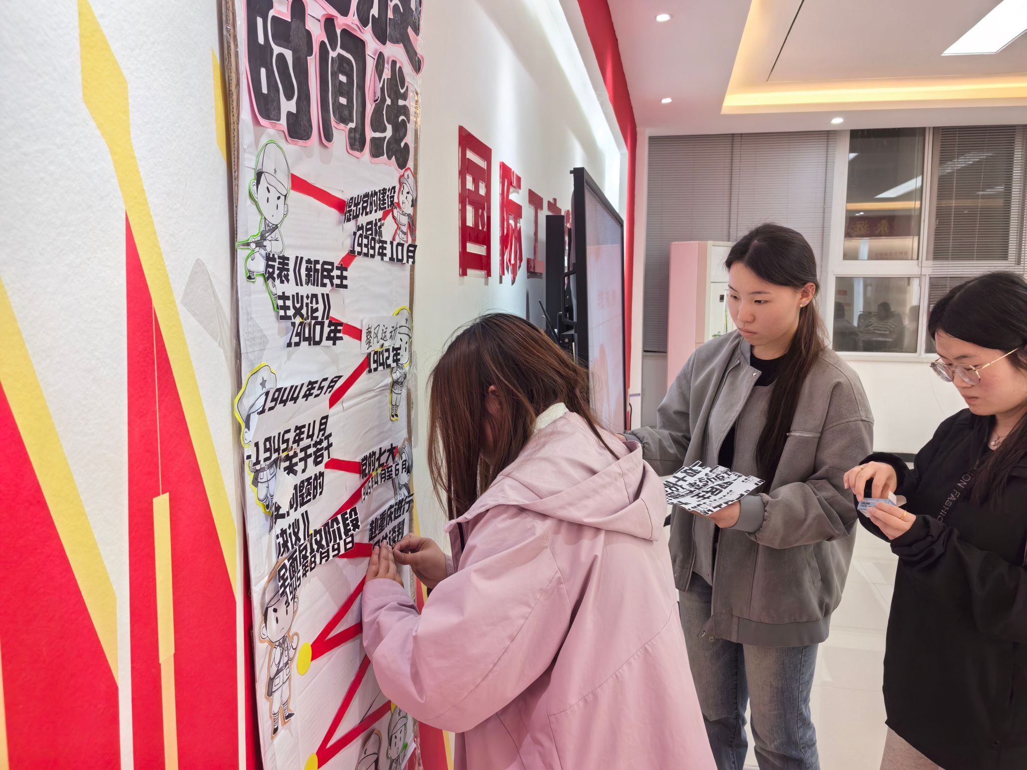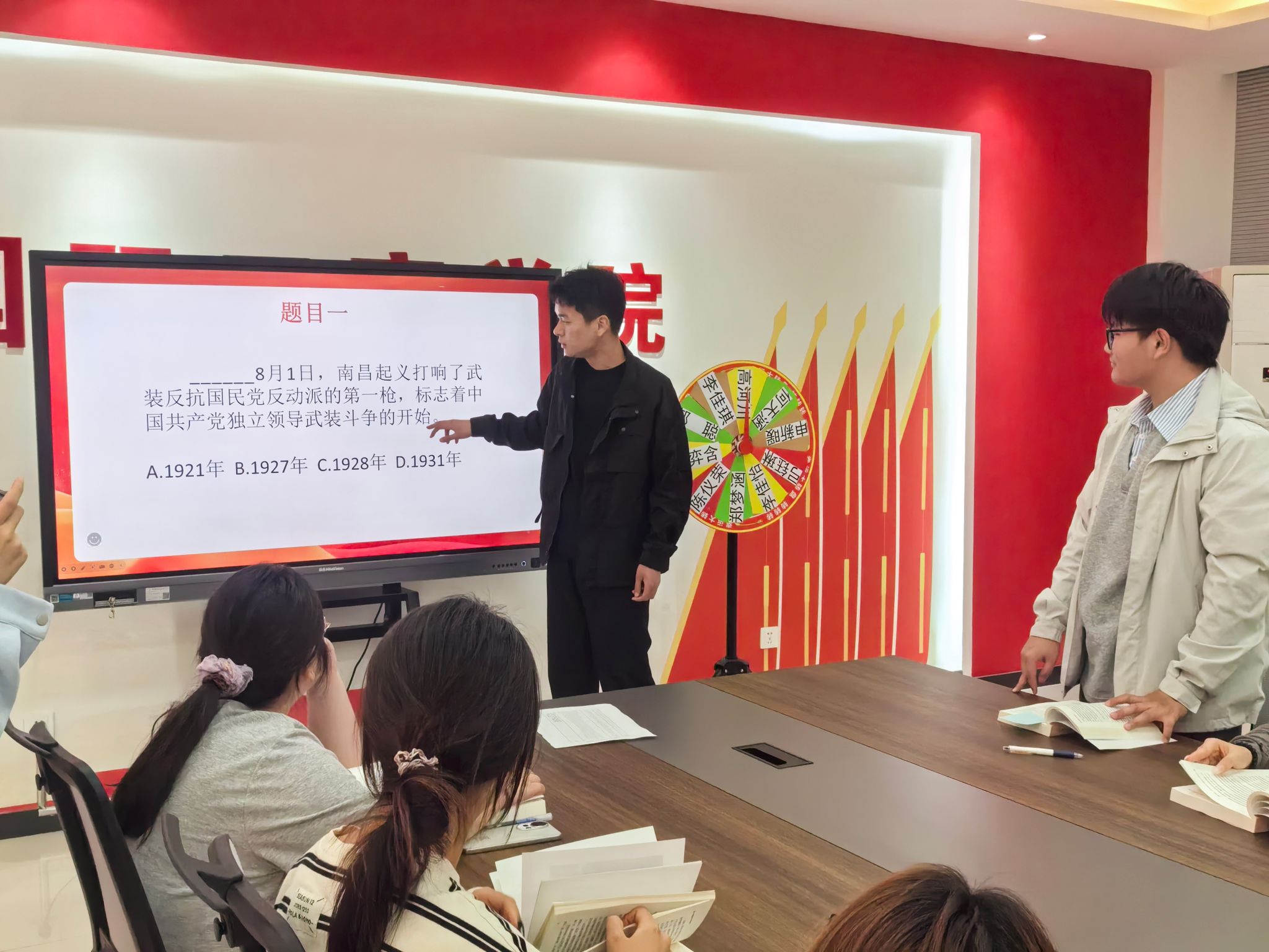 随后,进入“红色历史时间线”互动环节。转盘随机抽取同学组队,合作将历史事件贴到时间线的正确位置,并由其他同学进行检查和修改。这既考验了大家对党史脉络的熟悉程度,也在“贴”与“改”的过程中强化了大家的历史认知与团队协作能力,现场掌声不断,气氛热烈。