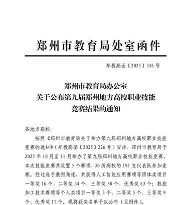 近日,《郑州市教育局办公室关于公布第九届郑州地方高校职业技能竞赛结果的通知》(郑教高函〔2025〕326号),对本次获奖的师生进行了表彰。我校在团体类人工智能应用挑战赛赛项获二等奖1个,个人类数控加工技术(数控车)赛项获二等奖1个、三等奖1个。