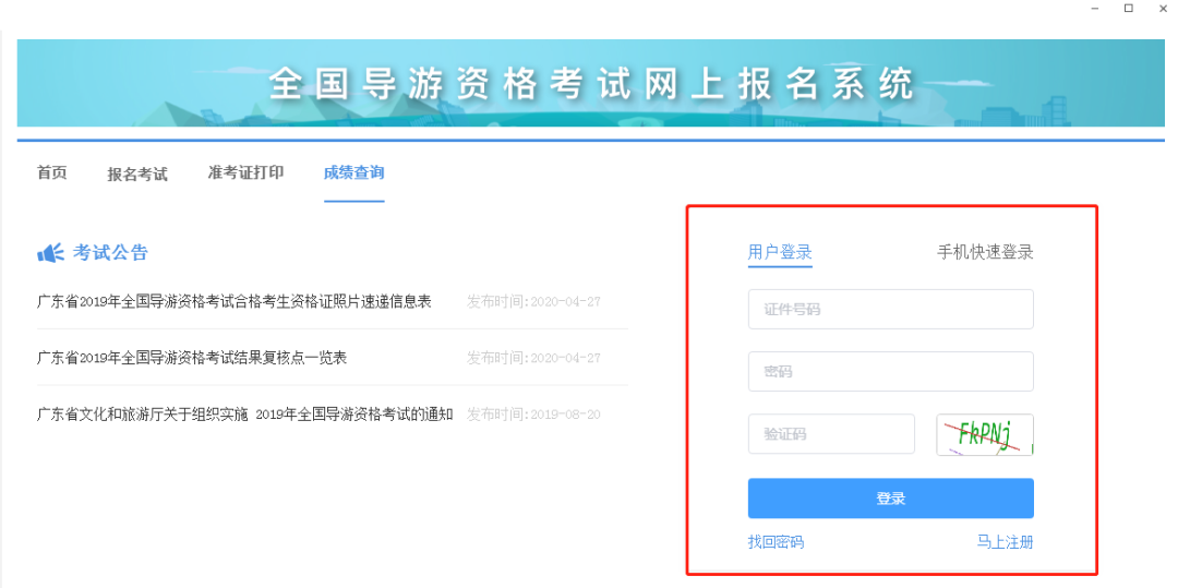 2)选择报考省份后,输入用户名及登录密码,填写验证码,点击“登录”即可进入系统查询成绩(可以选择注册时的证件号或者手机号登录)。