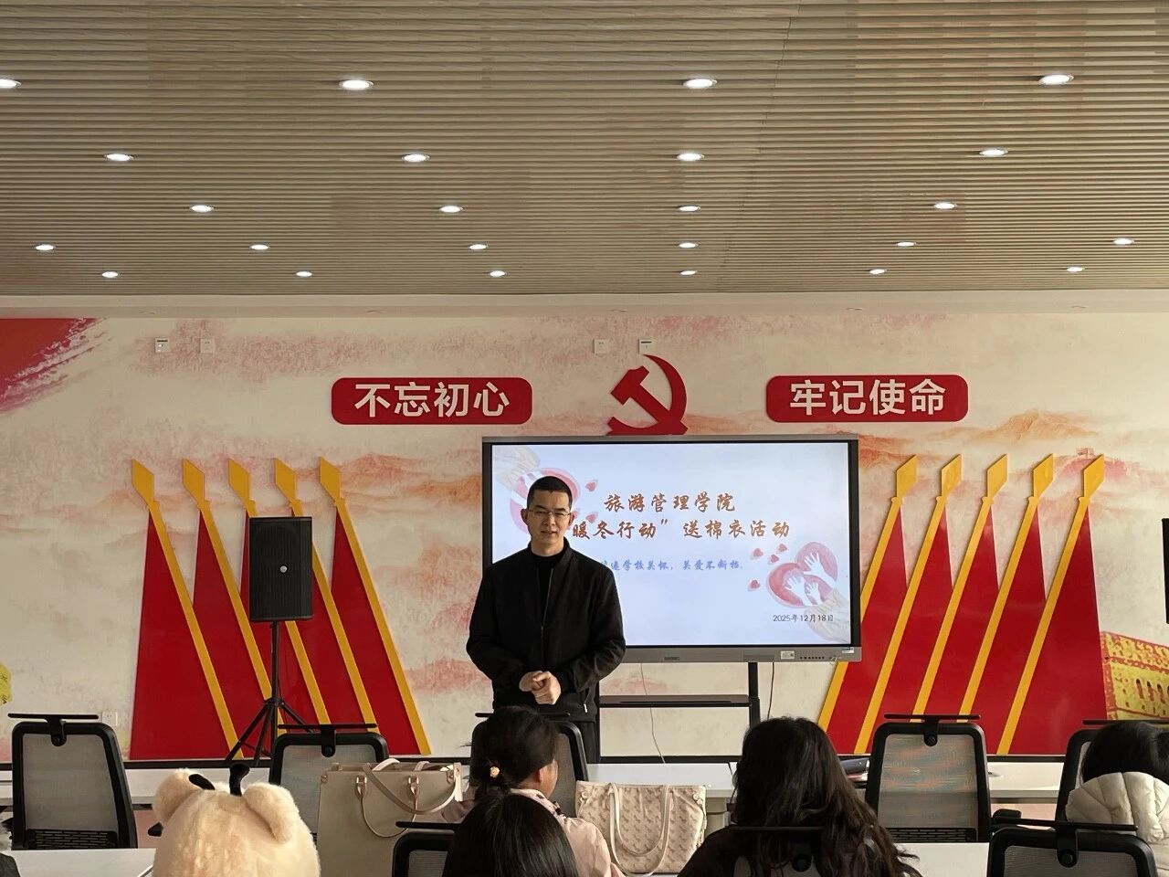 寒风催冬意,温情暖学子。12月18日上午,旅游管理学院5A党建馆内暖意融融,“暖冬行动”送棉衣活动在此温情启幕。学院党总支书记陈海彬、副书记张楗让将一件件承载着学院关怀的棉衣送到困难学生代表手中,用贴心举措为学子们抵御严寒,让他们在冬日校园里感受到“家”的温暖。