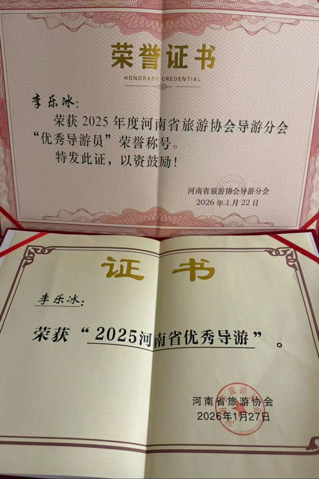 实习期间,李乐冰始终坚守服务初心,以优质、贴心的服务赢得了游客的广泛赞誉,2025年全年荣获游客赠送锦旗两面,用实干收获口碑、用服务诠释担当。2026年1月,凭借实习期间的突出表现和优异业绩,她更是接连斩获“2025河南省优秀导游”、2025年度河南省旅游协会导游分会“优秀导游员”两项重磅荣誉,成为全省导游行业青年群体中的标杆,也成为实习期间斩获省级荣誉的优秀典范。