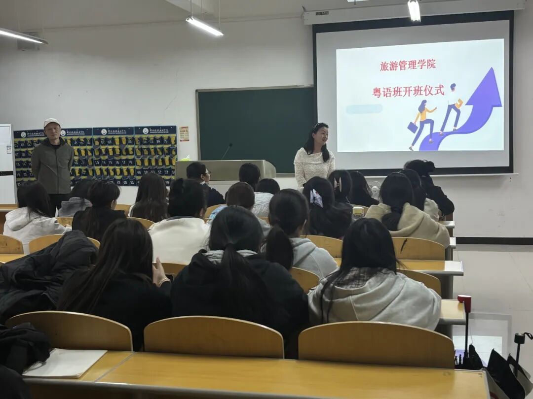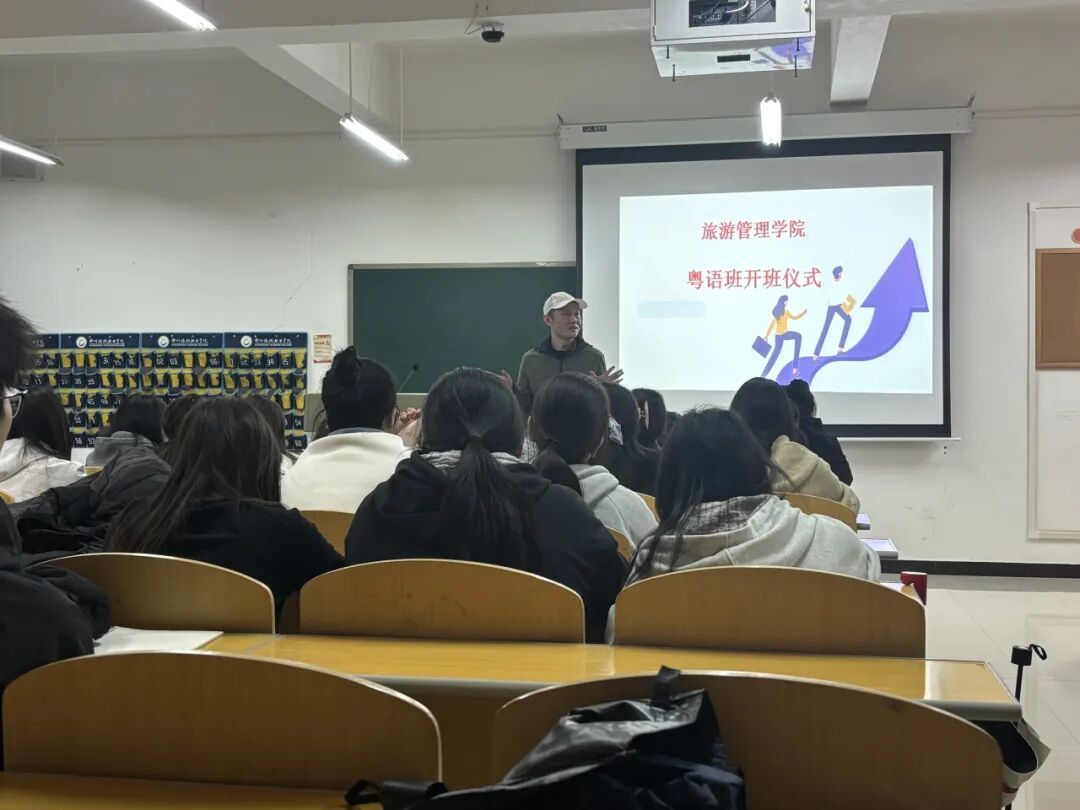 为丰富校园文化生活,助力旅游专业学生提升语言技能,4月8日下午,旅游管理学院2024级粤语培训班在5A402教室正式开班,来自2024级不同专业的40余名同学参与了本次培训。培训班旨在满足同学们面向大湾区实习和就业的诉求,同时也是面向来自大湾区的客人如何提供更加有针对性的在地旅游服务所进行的人才培养路径新探索。