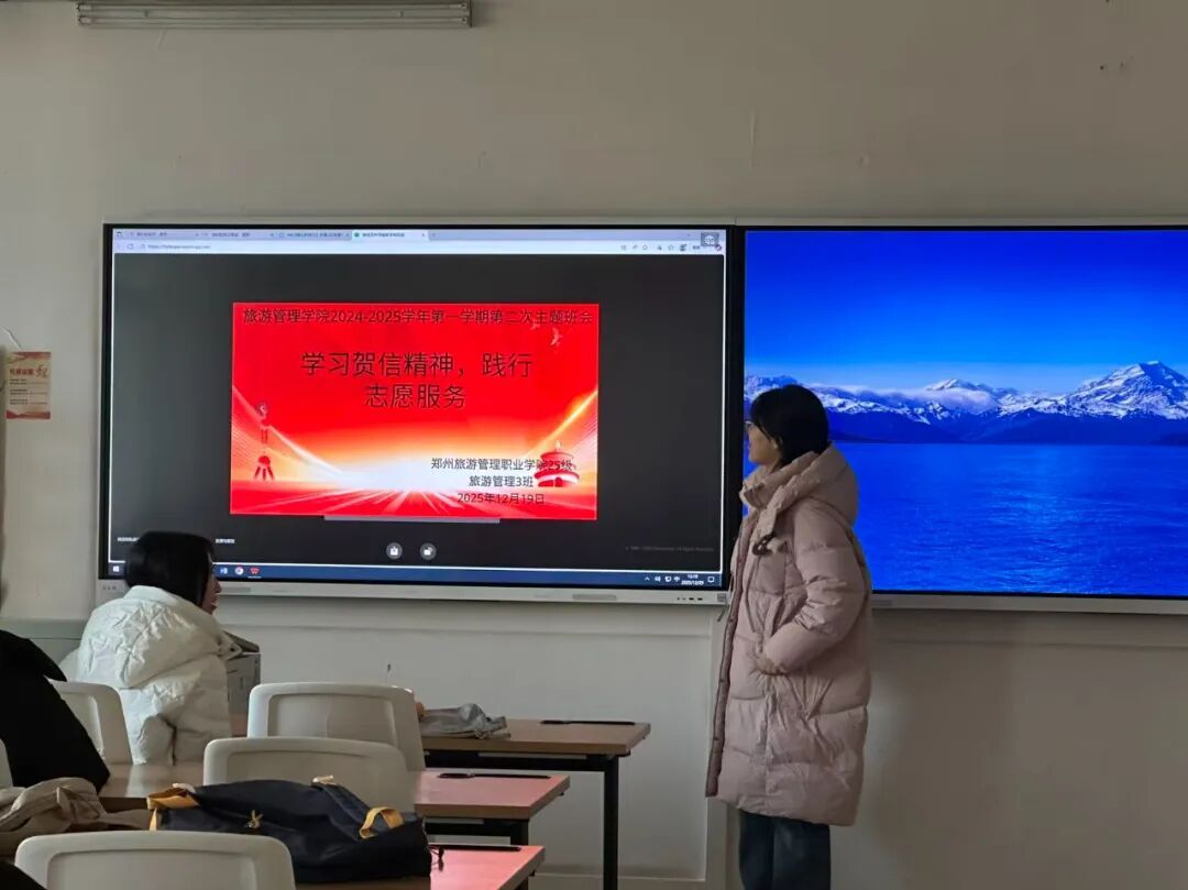 班会上,班主任领学贺信原文、解读核心要义,引导同学们深刻领会“志愿服务是社会文明进步的重要标志”的深刻内涵,牢记总书记殷切嘱托;随后,班会围绕践行贺信精神展开热议,同学们结合景区文明引导、社区敬老、校园值守等志愿实践分享感悟,纷纷表态将立足专业所长,大力弘扬志愿精神,主动投身志愿服务,以实际行动践行“奉献、友爱、互助、进步”的志愿精神,把青春力量融入强国建设、民族复兴伟业。