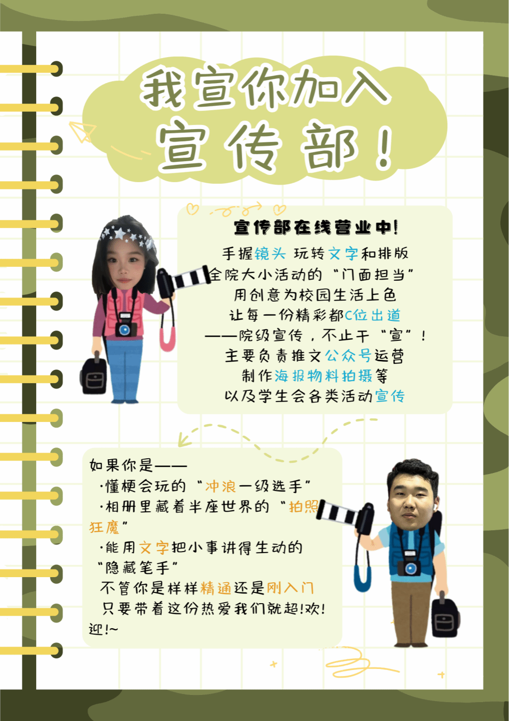 致力于提升学院的社会影响力和内部凝聚力,负责各类学生活动的前后期宣传工作,通过创意海报、摄影及短视频等多元形式,全面、及时、准确地宣传学院的各项活动、教学成果和师生风采。培养宣传团队的创新能力和专业素养,不断提升宣传工作的质量和效果。我们期待更多有志于宣传工作的同学加入我们的团队!