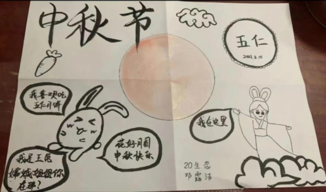 中秋的月儿圆圆、中秋的月饼香香,中秋的话儿甜甜,中秋的快乐多多……通过“画”中秋,同学们表达了对中秋文化的喜爱,也懂得了中秋佳节的团圆美好之意。