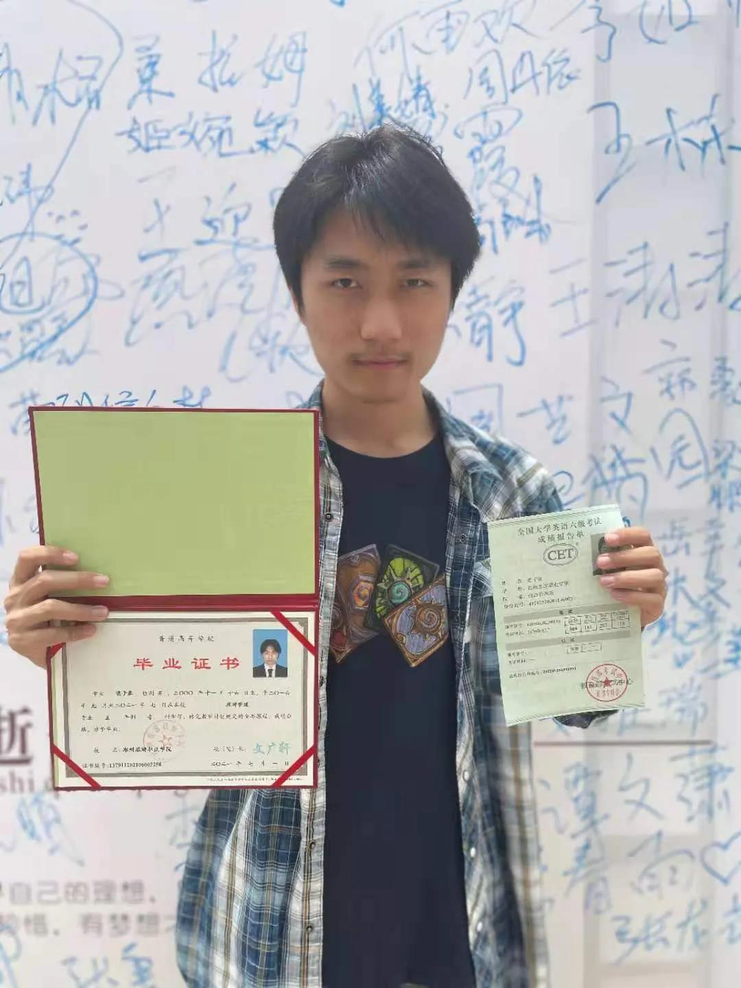 2016级五年制旅游管理2班梁子豪同学在班主任郑艳平老师处不但领到毕业证,也领到了英语六级成绩单,看着504分的成绩,得到了周围老师们和同学们的祝贺和赞誉,梁子豪表示自己一定会学以致用,用自己在学校学到的知识在未来的旅游事业中做出成绩。