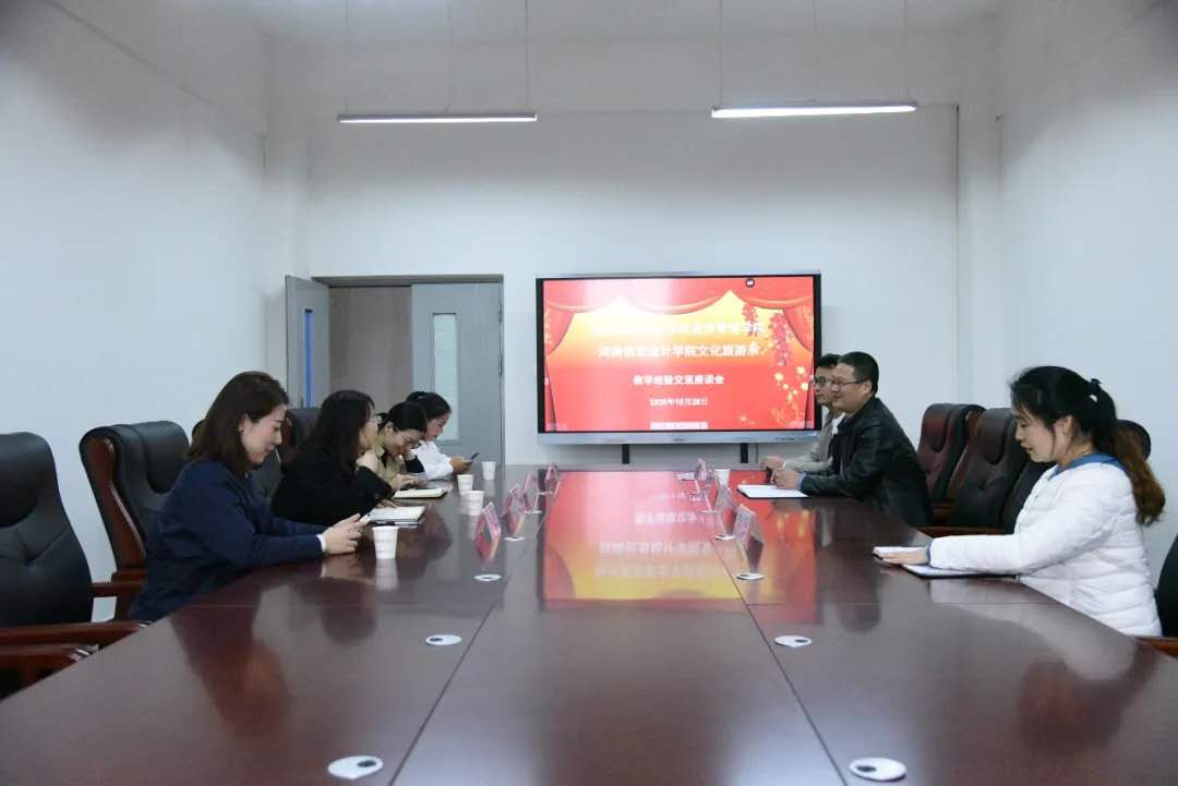 10月28日下午3:30,河南信息统计职业学院一行4人在文化旅游系芦梅主任带领下来我院参观交流。交流座谈会在我院5号楼4楼会议室召开。我院党总支书记、院长肖靖委托副院长秦合岗热情接待,办公室主任刘海涛,教学秘书李志丹参加了座谈会。