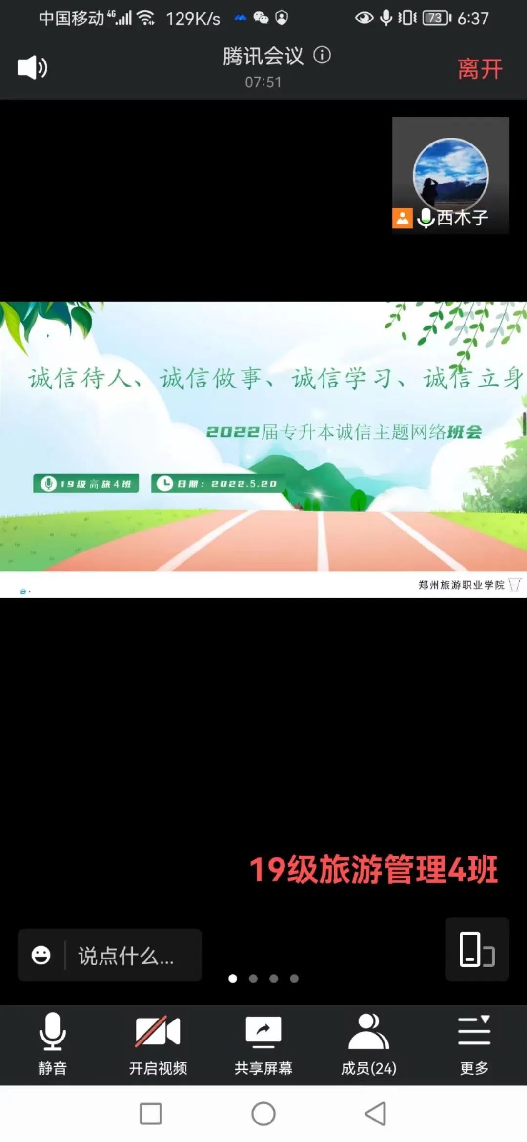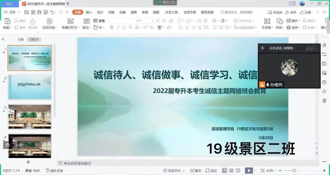 为切实做好2022年专科毕业生专升本考试相关工作,切实加强专升本考试期间的诚信教育,进一步端正考风、严肃考纪、营造文明、诚信考试的良好考风和学风的形成,进一步做好考生考前思想教育及心理疏导工作。2022年5月22日旅游管理学院2019级各班班主任、辅导员组织各个班级考生通过线上视频会议的形式开展2022年专升本考前诚信主题教育班会。