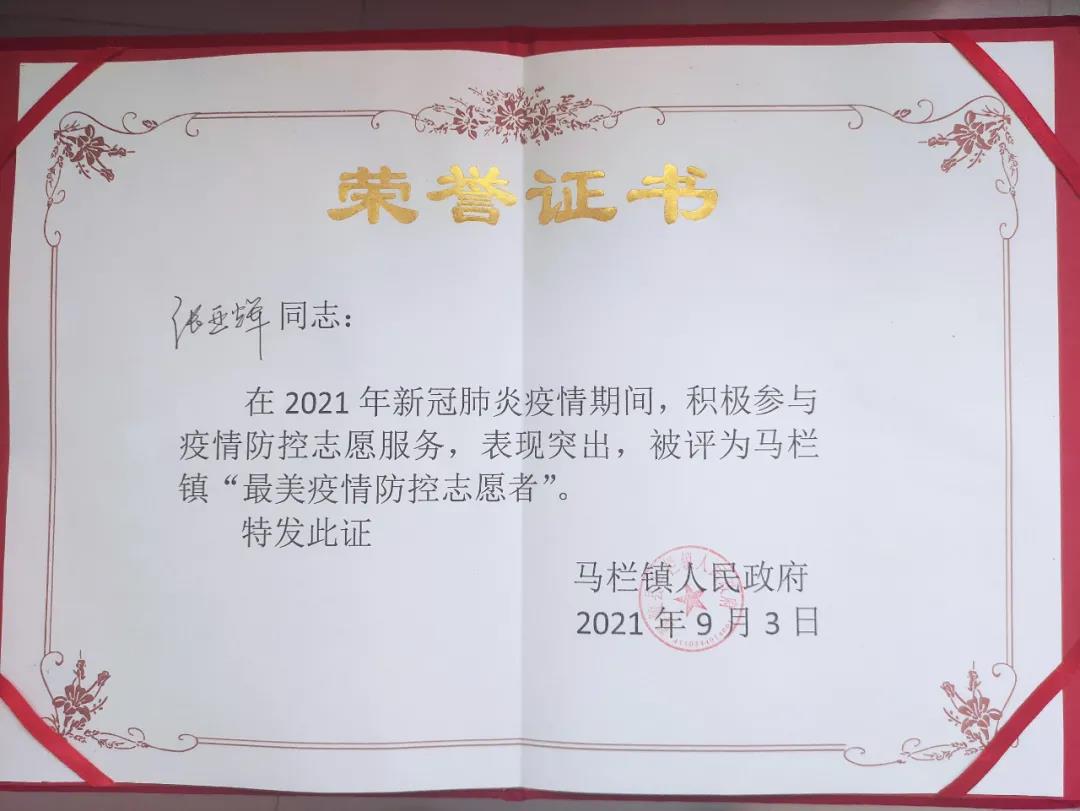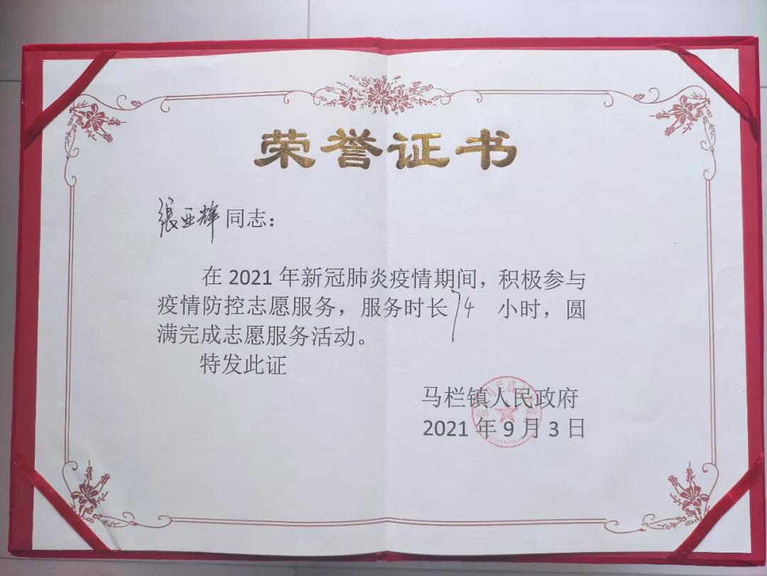 当郑州疫情再度爆发后,根据国家和省、市关于应对新冠肺炎疫情防控的要求,我又一次站了出来,积极主动加入到我们镇“新时代文明实践所志愿者服务队”,希望能够在我县进行全员核酸检测期间,尽一份自己的绵薄之力。由于留在村中的大部分都是老年人和儿童,并不会熟练使用智能手机,但是在核酸检测前,需要使用智能手机进行线上信息填写和预约,必须确保没有人员疏漏。因此,志愿者服务团队必须要充分走访询问,挨家挨户询问预约码,这无疑是工作量非常大的一次任务,但是我所在的志愿服务团队不辞辛劳,兵分几路,同时进行。在我县全面实施核酸检测期间,从8月15日开始,由于核酸检测人群众多,为了快速且高效率完成任务,志愿者队伍每天早上七点就集合,然后分到不同的村镇开始作业,我们志愿者进行核酸检测现场的秩序维护、引导、讲解有关信息、电脑录入核酸信息等工作。有时还要帮助医生进行核酸检测信息采集,遇到人多的时候中午也不能休息,还好,村民们也都积极配合工作,最终圆满完成了庞大的全员核酸检测任务。在这期间,镇卫生院也组织学校12—17岁学生集体打疫苗,由于现场人手不够,我们志愿者团队也去了现场,出入人口登记、维持学生接种秩序、引导学生接种疫苗、安排人手给家长们讲解有关接种事项。志愿者证书