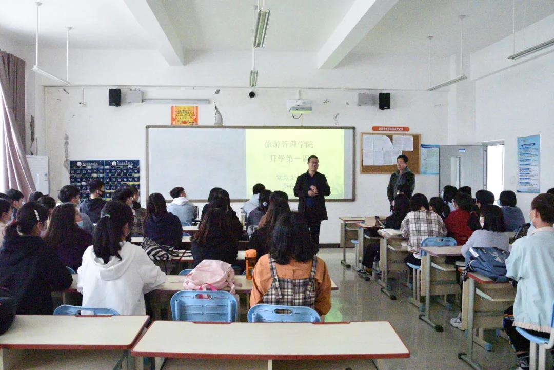 3月29日中午12:30,旅游管理学院党总支书记秦合岗在5号教学楼为2020级学生讲授思政课,他以“新时代青年的责任与担当”为题作报告,学院2020级学生代表参与课程。