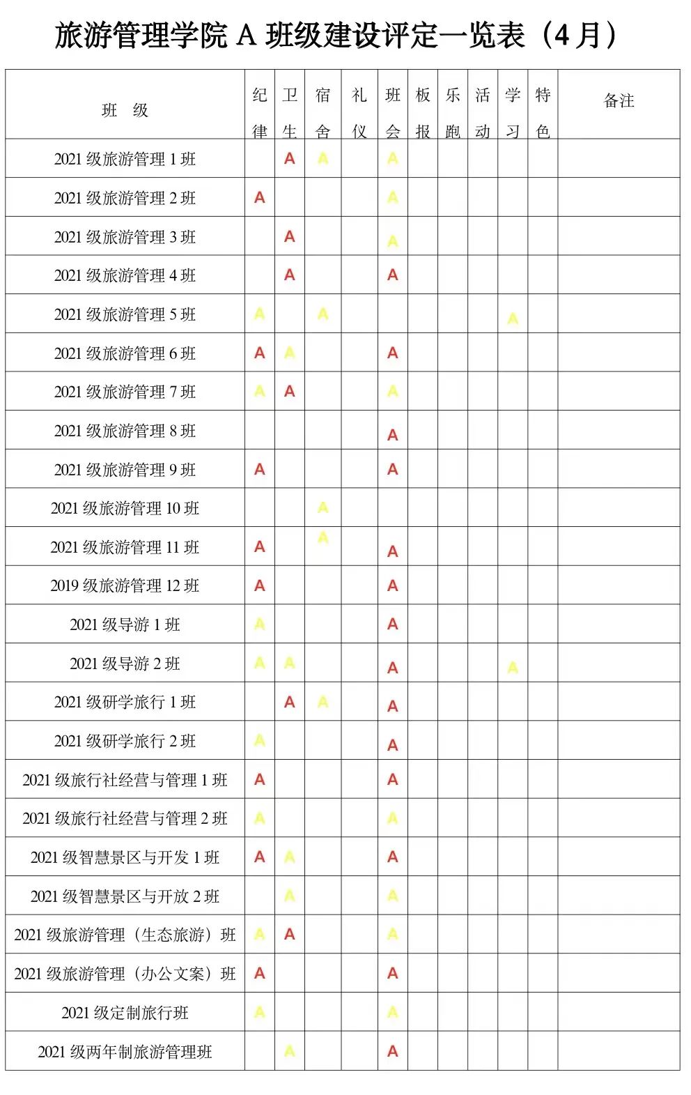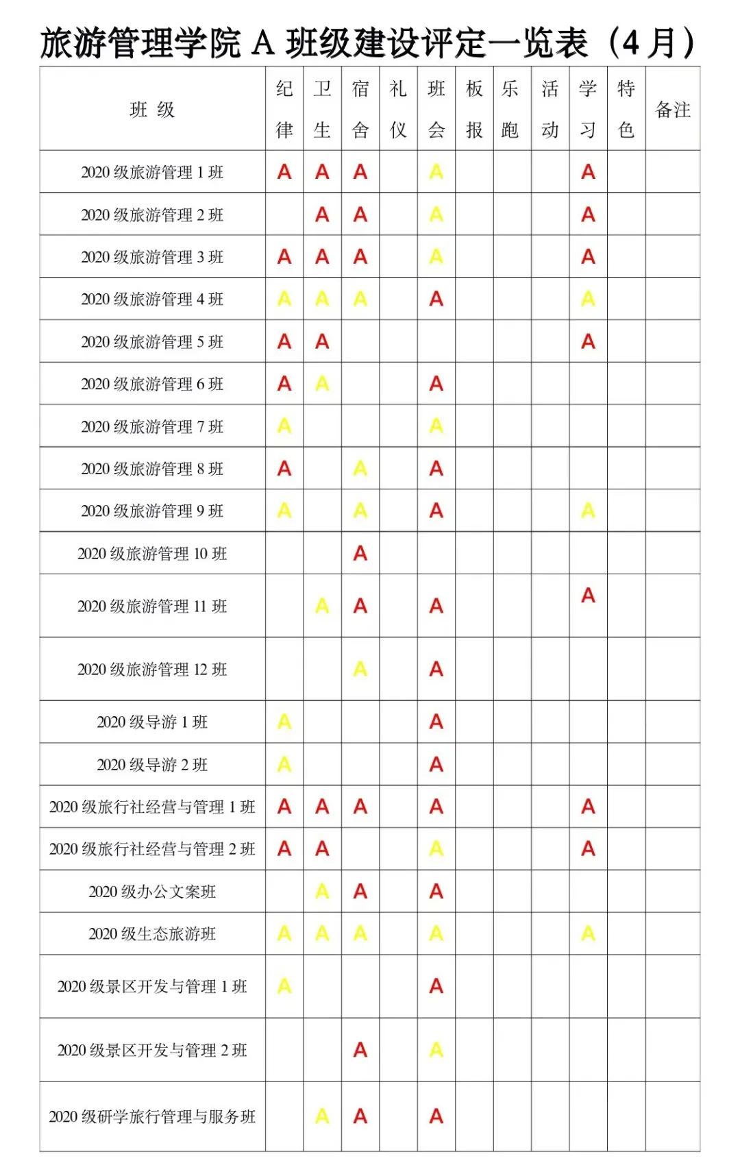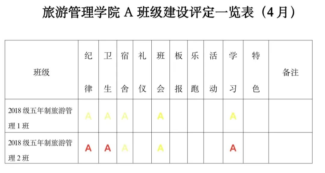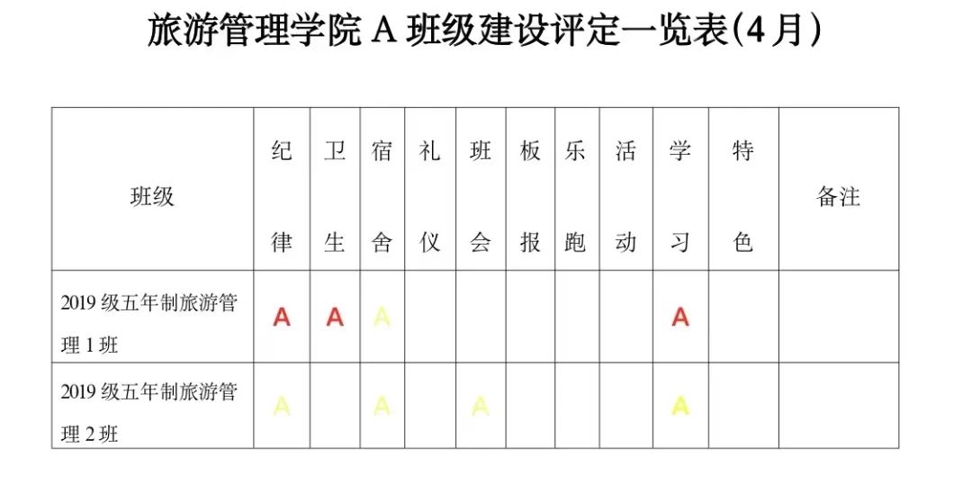 为进一步深化学院“三全育人”综合改革试点工作,贯彻学院“三全育人”工作要求,实现全方位育人。全面促进学生“三素养”教育不断提升,坚持立德树人,把培育和践行社会主义核心价值观落到实处;为培养学生的责任感、荣誉感、合作意识、奋斗意识和竞争意识,激发学生进取心,坚持以学生为本,把正能量融入学生教育、管理和服务的全过程。经研究,结合校院实际,参照A级景区评定规则,实施A级班级建设评定标准,由以往的上墙授牌转变为每月用微信公众号的方式推送,使学生学有榜样、赶有方向、比有对手、追有目标,为校院的可持续发展注入新动力!