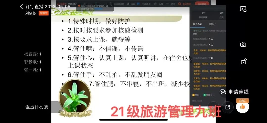 当前新冠肺炎疫情防控形势依然严峻复杂,为进一步做好疫情防控宣传,增强学生的疫情防控意识,引导学生乐观、积极、科学地面对疫情,2022年5月5日旅游管理学院各班通过线上视频会议的形式召开疫情防控主题班会,班会由各班班主任主持,全体在校学生参加。