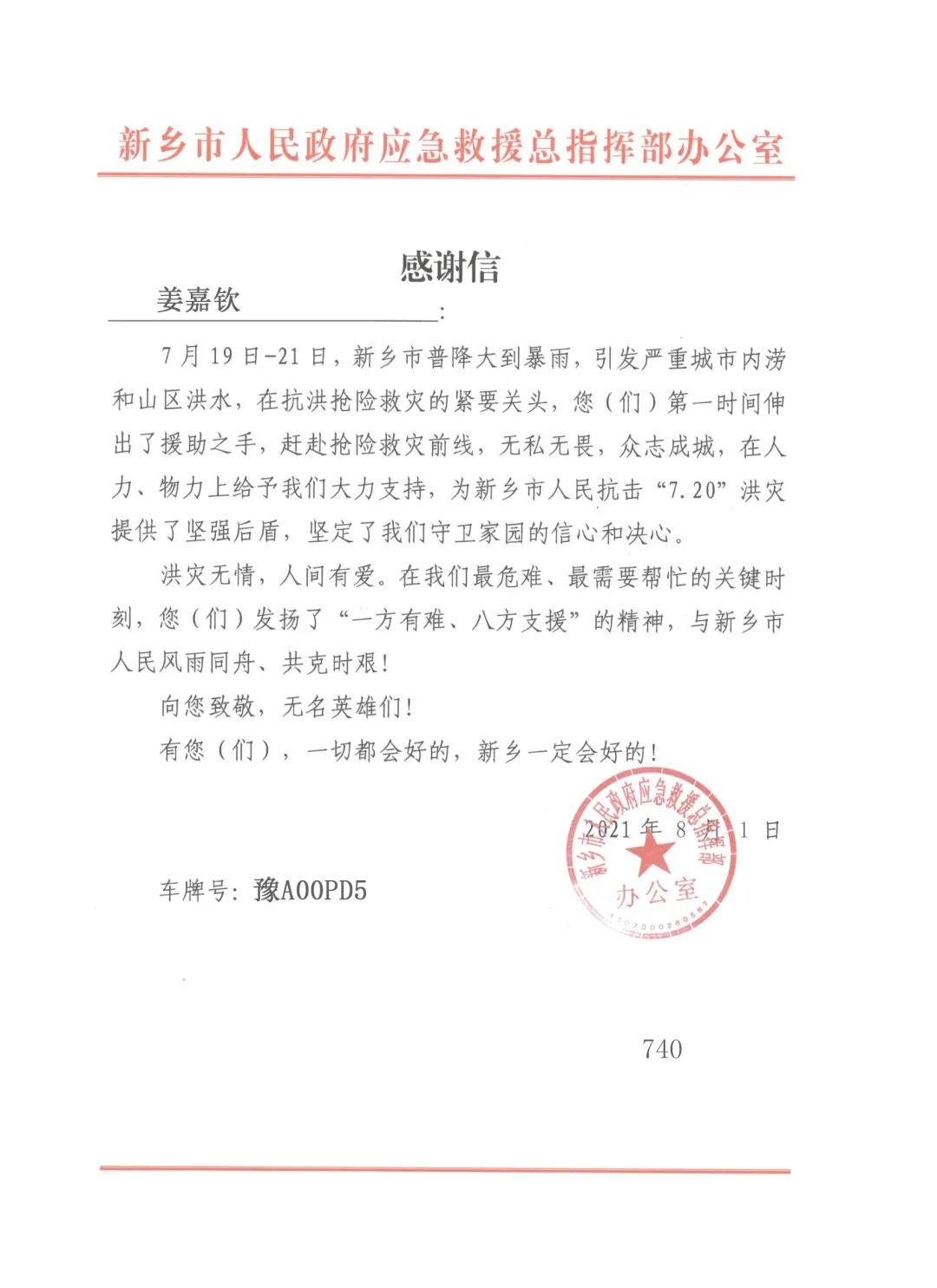 7月23日凌晨,姜嘉钦在看了政府新闻报告和微信朋友圈了解到相关情况之后,知道了新乡市卫辉市等地受灾严重,且救灾人手严重不足,姜嘉钦在第一时间开始联系相关人员并加入了利刃救援队,自己驾车奔赴新乡卫辉参与救援。7月23日凌晨三点半与救援队集结完毕,携带冲锋舟、救生衣等应急救灾工具和应急物资,冒雨奔赴新乡卫辉参与人员救援工作,东北人骨子里的热情与仗义,在这一刻又一次充分展现。