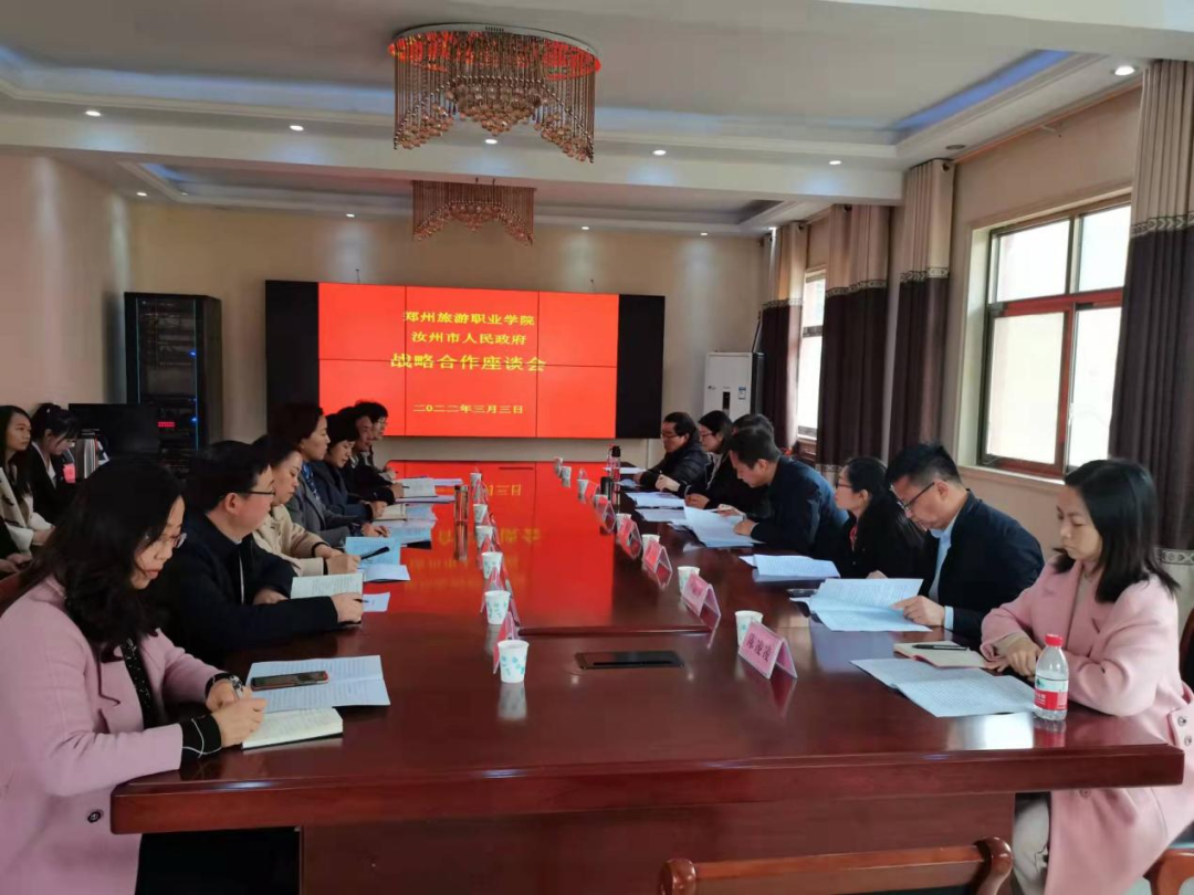 3月3日,郑州旅游职业学院党委委员、副校长徐永清,带领发展中心主任朱宇,旅游管理学院院长李俊,烹饪食品学院院长李晓东,现代服务学院院长许向蒲,旅游管理学院党支副书记张楗让,教研室主任贾玉芳和陈凌凌赴汝州市就校地战略合作的推进进行了座谈交流及实地调研。汝州市委常委、宣传部长、市政府副市长赵占营,市政府党组成员、副县级干部史清秀,市政府办公室纪检组长王继军,市文化广电和旅游局党组书记张志强,市文化广电和旅游局党组成员、副局长党晓叶,市文化广电和旅游局主任科员桂爱红,市文化广电和旅游局党组成员张鹏鹏和林丽红参加了战略合作座谈会。