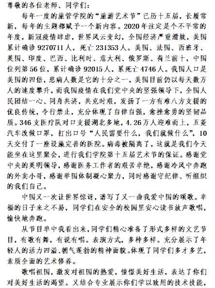 活动伊始,王振超副校长致辞。他说,我国疫情在党中央的坚决领导下,全国人民团结一心,同舟共济,共克时艰,发扬了一方有难八方支援的优良传统。充分体现了中华民族自强,自律的坚韧品质。在此期间,也有我院学生舍小我,顾大局,赶往前线参与抗疫工作并平安归来。因为有抗疫战士们的保驾护航,我们得以在安全的校园里努力学习,放声歌唱。修养是每个人必修的功课,通过对艺术的追求,展现你们对艺术的积淀。希望20级的新同学们在旅院这个大家庭里努力学习,提升自我,前程似锦。最后,他宣布旅游管理学院第十五届旅游艺术节正式开幕!