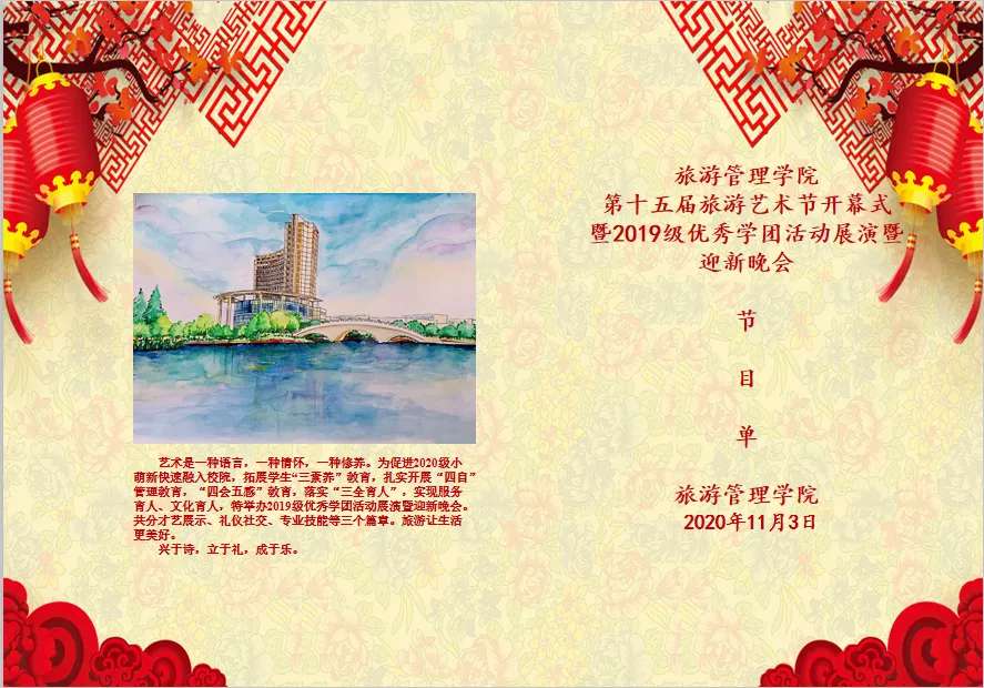 艺术可以陶冶心灵,艺术可以鼓舞人心,艺术可以丰富人生。旅游艺术节的开展立足于旅游专业特点,致力于展现旅游艺术魅力,传承优秀文化,丰富校园文化生活,拓展艺术视野,实现以美育人、以美化人目标,强化文化育人、服务育人,为将学生培养为德才兼备、全面发展的旅游人才提供有力保障。