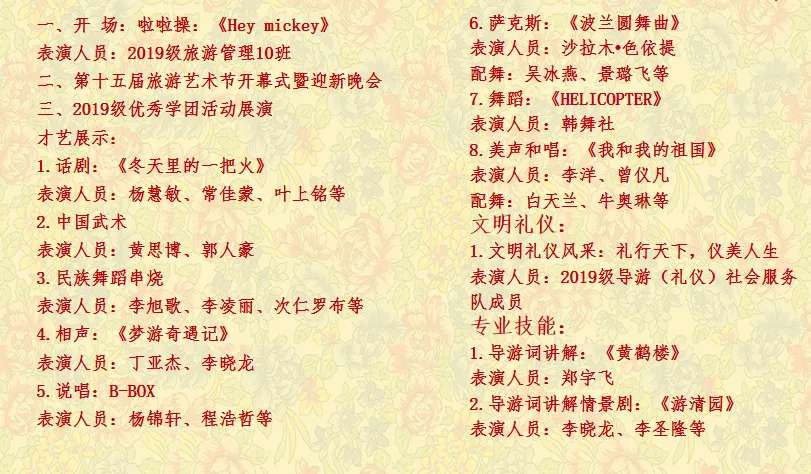 为扎实推进学生专业素养、思政素养和职业素养的“三素养”教育引向纵深,坚持立德树人根本任务,深挖学生艺术潜能,强化学生活动品牌,构建全员育人、全程育人、全方位育人的“三全育人”环境,实现以美育人、以美化人目标,强化文化育人、服务育人,为培养学生成为德才兼备,全面发展的人才。我院于2020年11月3日下午6:00在象湖校区田径场举办第十五届旅游艺术节开幕式暨2019级优秀学团活动展演暨迎新晚会。