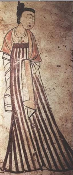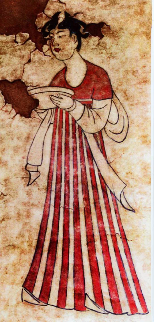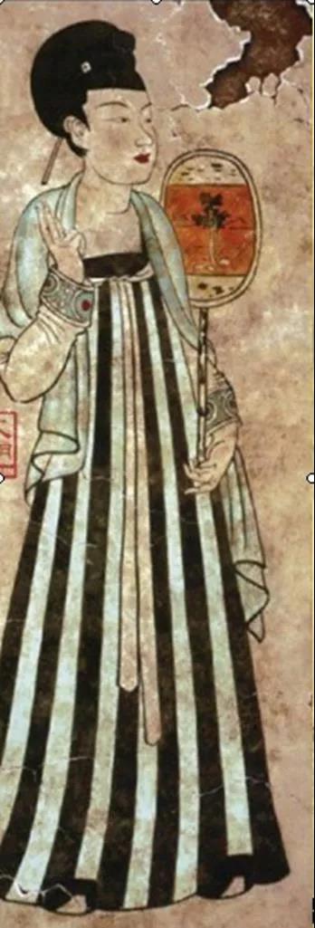 我们在唐代周昉绘制的《簪花仕女图》中可以看到,女子的大袖衫用薄如蝉翼的细纱制成,隐约可见臂膀上的肌肤,让人不由遐想纱衣下是怎样的肌理细腻、肤如凝脂,而图画中两位贵族女性的华美长裙更是引人注目。唐代长裙种类繁多,式样高雅,常见的有画裙、百叠裙、百鸟裙、花笼裙、间裙和石榴裙等。画裙是用特殊的颜料直接在裙子上作画,非常的潇洒写意,百叠裙是在腰间打了很多的细褶,百鸟裙则是用各种珍禽羽毛编织而成,还有金丝银线织就的花笼裙,走起路来,上面的花鸟蜂虫好像活的一样,非常奇妙。间裙多以两种或两种以上颜色的材料竖排间隔制成,常见的有红绿、红黄、黄白等不同的颜色搭配。在陕西的礼泉,有太宗的昭陵,昭陵附近有大量陪葬墓,像郑仁泰和李震是太宗倚重的文臣武将,段简璧是太宗的外甥女,燕妃则是太宗宠爱的妃子,这些墓葬中存有大量壁画,现在都存于昭陵博物馆,壁画中女子最常见的长裙就是间裙,在中唐以前,间裙确实比较流行。