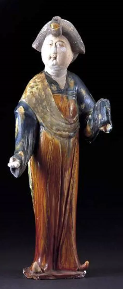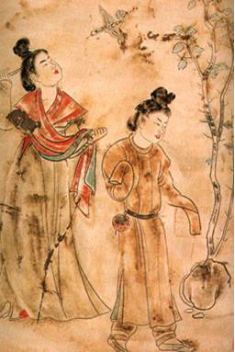 披帛是用轻细的罗纱裁制成的长巾,有单色的,也有按不同喜好绣上图案花纹。一般说来隋唐女子的日常装扮就是上着襦衫下着长裙,穿用时常辅以半臂、披帛。唐朝女子的服饰已经非常华美富丽了,但她们还不满足,为了让自己的服饰更为多姿多彩,她们还喜欢男装和胡服。女着男装的装扮是着圆领缺胯长袍,窄袖口,腰间有带,下穿小口裤,足穿浅口鞋。胡服则是着翻领窄袖袍,腰间有蹀躞带,下着小口裤,足登软锦履。唐代女性喜欢穿男装来显示自己的飒爽英姿,从宫廷贵妇到乡野村姑莫不如此。