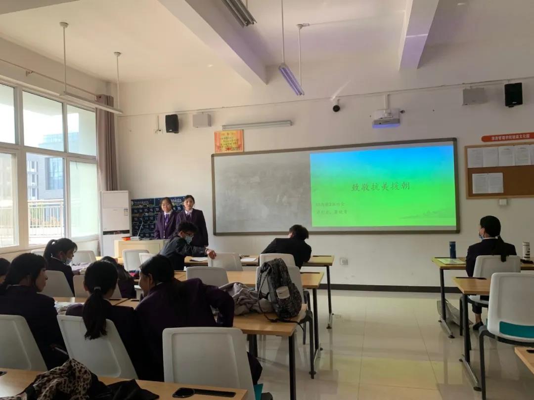 班会开始,主持人首先介绍了抗美援朝的历史背景,让同学们更加深入了解抗美援朝的历史。之后,分别向大家介绍了抗美援朝中涌现的英雄人物以及英雄人物的悲壮故事。通过观看影片,大家深刻体会到了如今幸福生活的来之不易,纷纷表示,作为新时代的青年,一定将铭记历史,弘扬抗美援朝精神,努力学习,坚定信念,向英雄学习,为实现中华民族伟大复兴的中国梦奋勇前行。