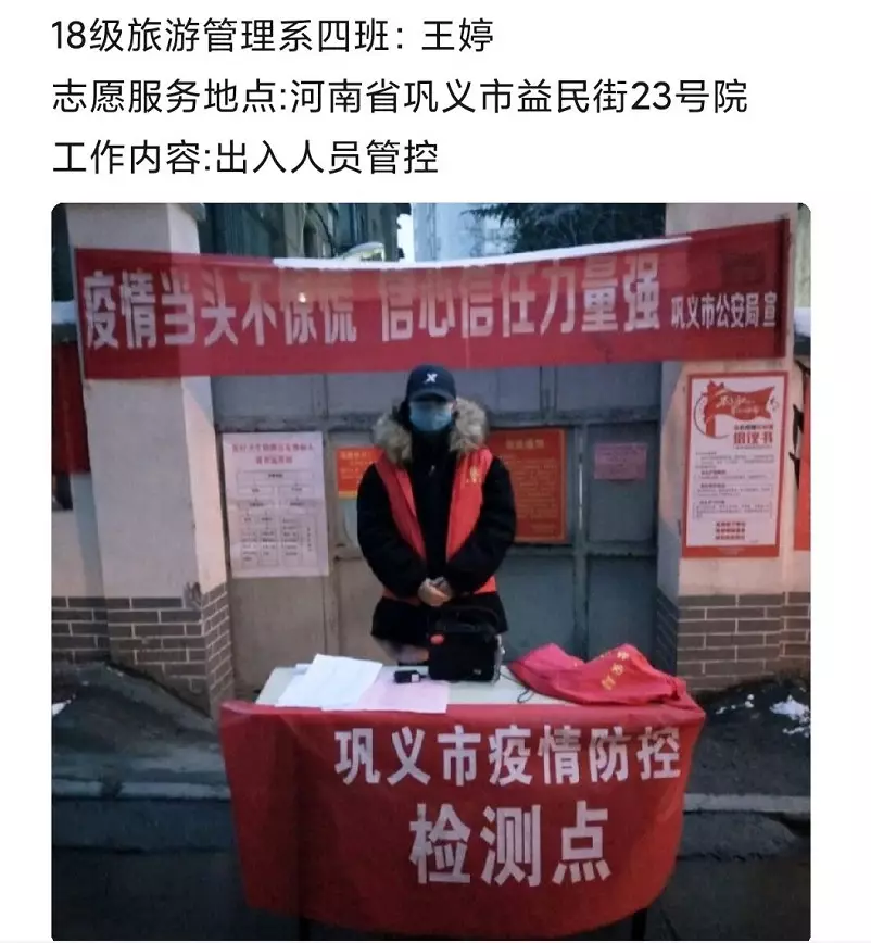 战“疫”进行时,志愿者在行动;领略“雷锋人”志愿服务精彩瞬间。在这场战“疫”中,有这样一群"郑旅学子"毅然决然投身于战“疫”前线,用年轻的身体担当起时代的重任,他们或在卡口帮忙登记量体温或是挨家挨户询问居民的身体状况。“旅管人”用自己力所能及的方式为这场战“疫”贡献一份力量。虽在这个危险的时光里,但却总有人会逆着人潮,向着生命流逝的方向艰难前行。