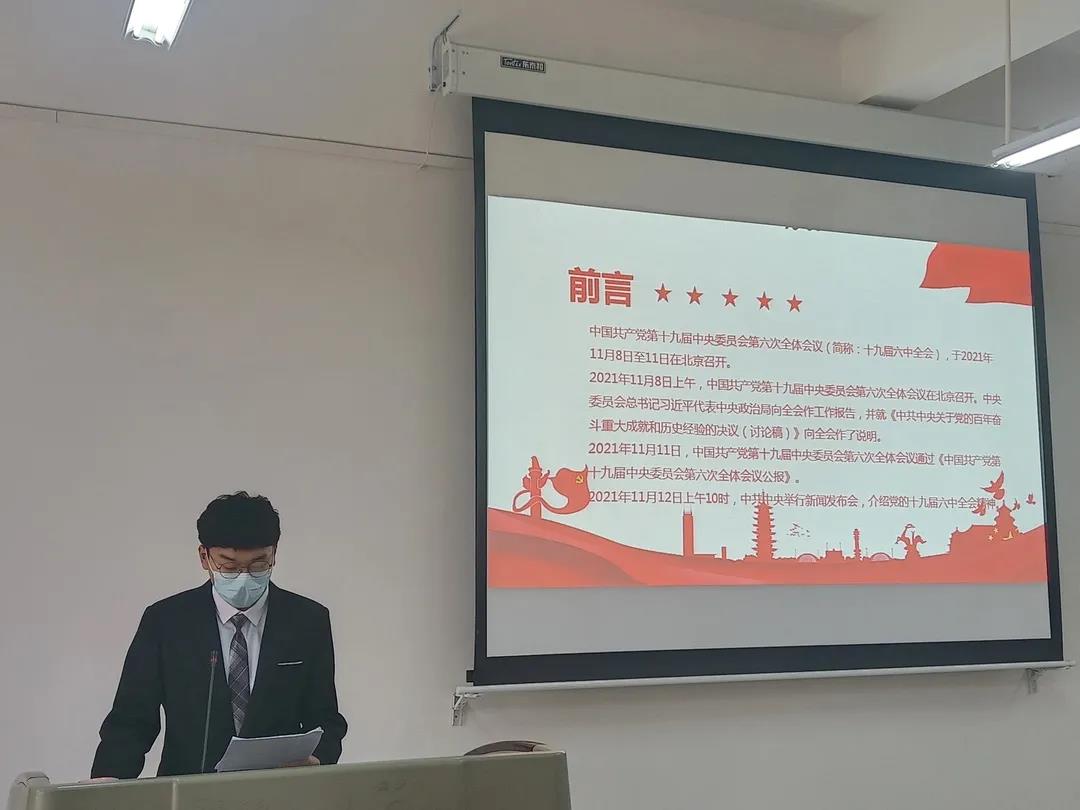 12月15日,旅游管理管理学院郑州青年讲师团学习贯彻党的十九届六中全会精神宣讲会在5A504开展。21级团学干部孙满意担任宣讲人。各班学生代表参加会议。