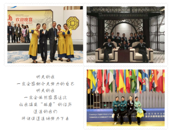 会议期间,业界大咖齐聚乌镇,古北水镇的精英奔赴乌镇,最新的思想在这里碰撞,最前沿的技术在这里展示,最优秀的工作人员在这里忙碌。而这里,有你们的身影——古北水镇的实习生们!你们向世界展示了新时代大学生的风采!