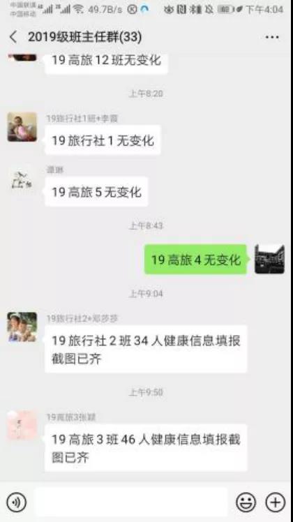 准时打开微信群,钉钉群,首先填报我和孩子的个人健康情况;然后再次确认班级移动情况,在19级班主任群和辅导员群上报,疫情无小事,我们每个人的上报都关系到集体的疫情管理工作,不能马虎。