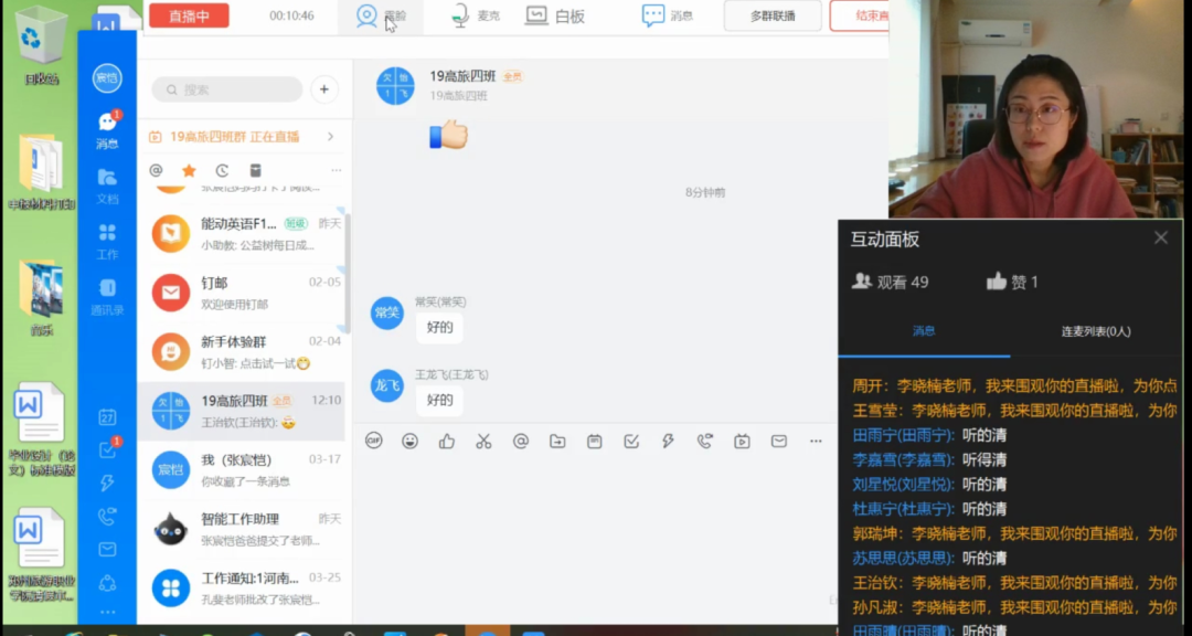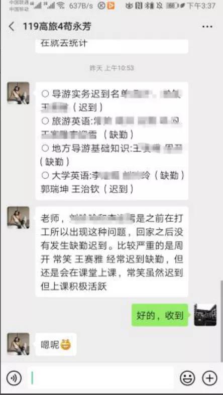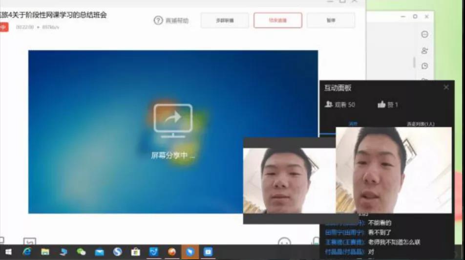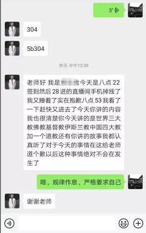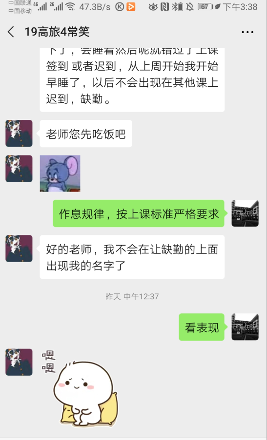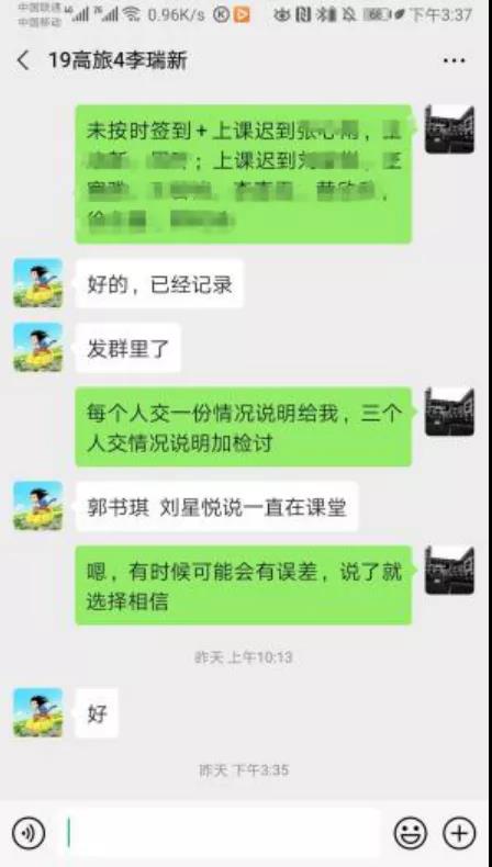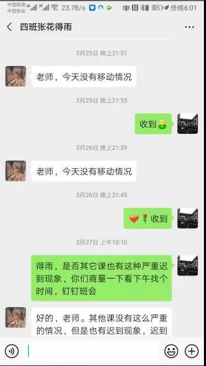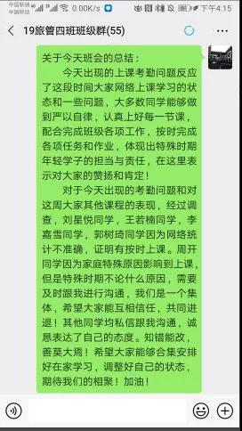但是孩子毕竟是孩子,难免有懈怠放松,今天上课我们班出现了迟到的情况,学习委员在跟我沟通一周学习情况时,也发现了问题,所以经过和班干沟通,班群征求意见,决定下课后通过钉钉直播召开班会。会上和大家强调了疫情期间关于网课和各种上报工作的重要性,大家也表示要克服小毛病严格要求自己。会后要求出现问题的同学要私信和我联系。