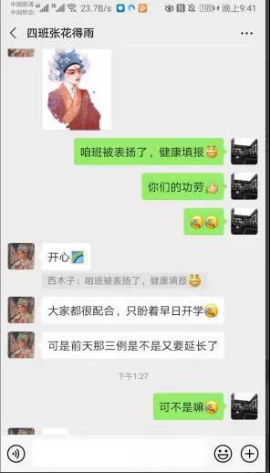 其实这次疫情期间,做为班主任的我很感动,事实证明我们的孩子们在大是大非面前是拎的清的。从我的班干部到我的学生们,表现出了高度的配合,没有耽误任何一个上报,没有无谓的埋怨抱怨,无论是班级工作还是网络课程,他们都给予我最大的支持。