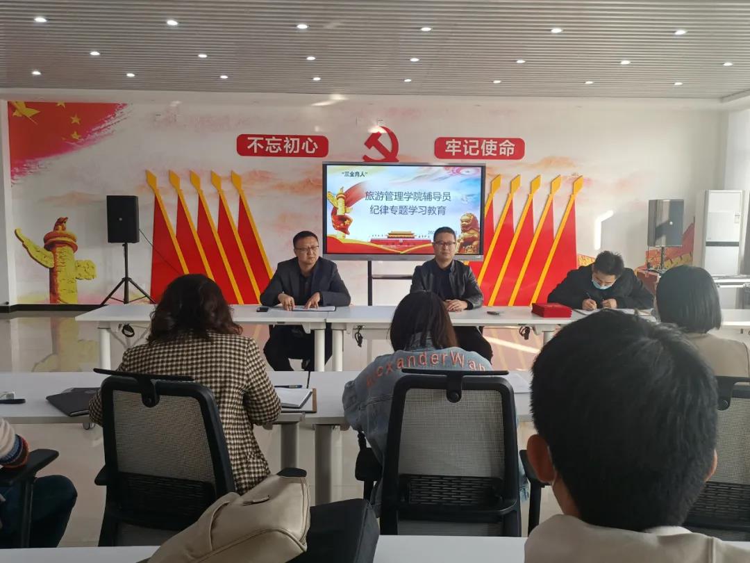 10月25日下午,旅游管理学院辅导员纪律专题学习会议在4楼会议室召开。党总支书记秦合岗,党总支副书记张楗让,团总支代书记苏涛以及全体专兼职辅导员参加会议。会议由张楗让主持。