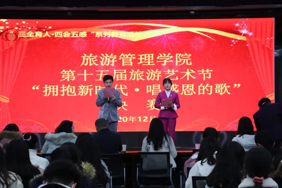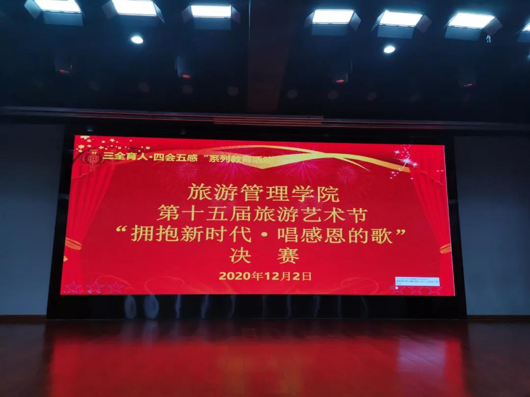 12月2日下午1:30,旅游管理学院于综合楼B楼四楼演播室举办“三全”育人——第十五届旅游艺术节——“四会五感”教育活动——“拥抱新时代•唱感恩的歌”总决赛。 出席并担任本次比赛评委的领导老师有旅游管理学院党总支书记、院长肖靖,党总支副书记张笃川,团总支书记金慧慧,辅导员老师程婕、郑艳萍、张凯迪、舒展、仝璐、李雪妮等。大赛由李圣隆和陈静园主持。经过初赛和复赛的层层选拔,共有六支队伍突出重围,成功闯入决赛。