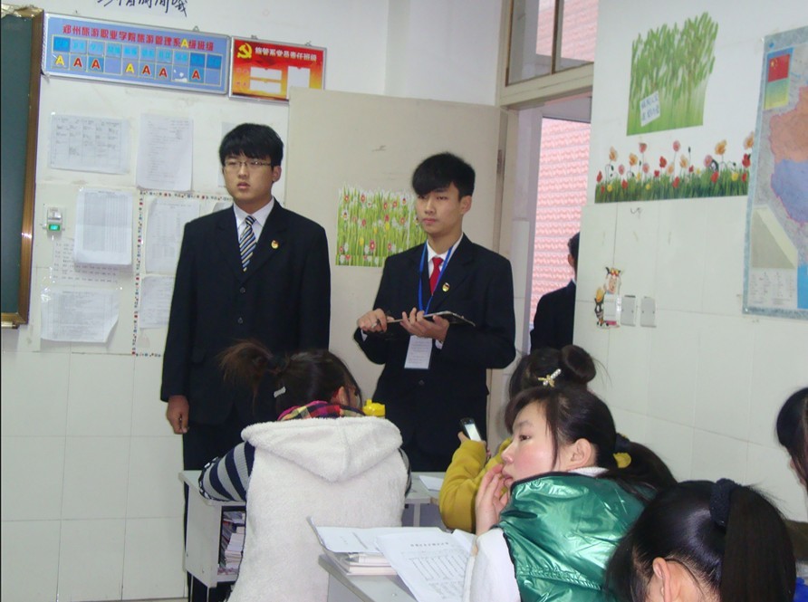 在查班过程中, 查办人员认真仔细,对每项问题都细心询问,并落实情况,认真负责,同时对卫生工作的检查也是涉及全面,外栏、地面,黑板、窗台等细微问题,并且针对各班的打扫进行合理评分。