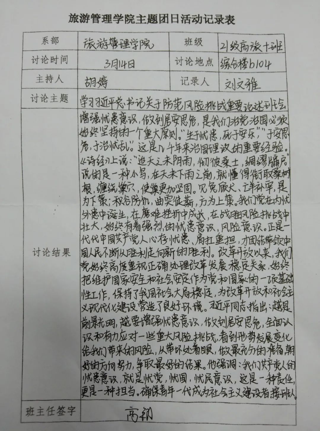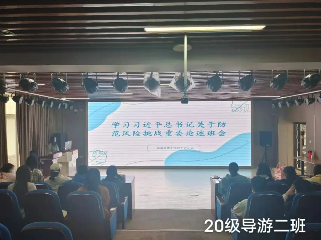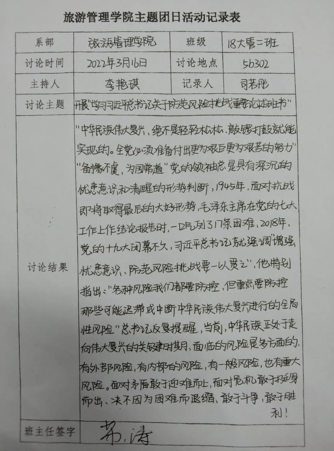 为深入学习“习近平总书记关于防范风险挑战重要论述”,贯彻落实安全理念,筑牢制度防线,增强忧患意识,提高防控能力,及时防范化解学生生活学习中可能发生的重大风险。2022年3月15日旅游管理学院组织各班级召开“学习习近平总书记关于防范风险挑战重要论述班会”。全体学生参加班会,班会由各班班主任主持。