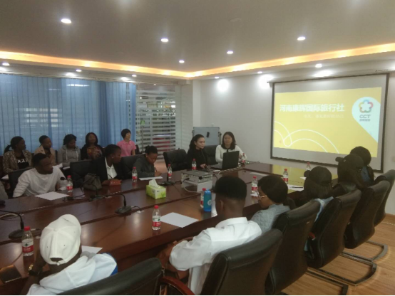 为了让我系南非留学生更加深入了解我国的旅游行业,2019年5月7日下午,旅游管理系南非班班主任程鹏老师、郭盼盼老师和杜鑫老师、李晨曦老师带领各班南非留学生分别前往河南中国旅行社和康辉旅行社进行专业见习活动。