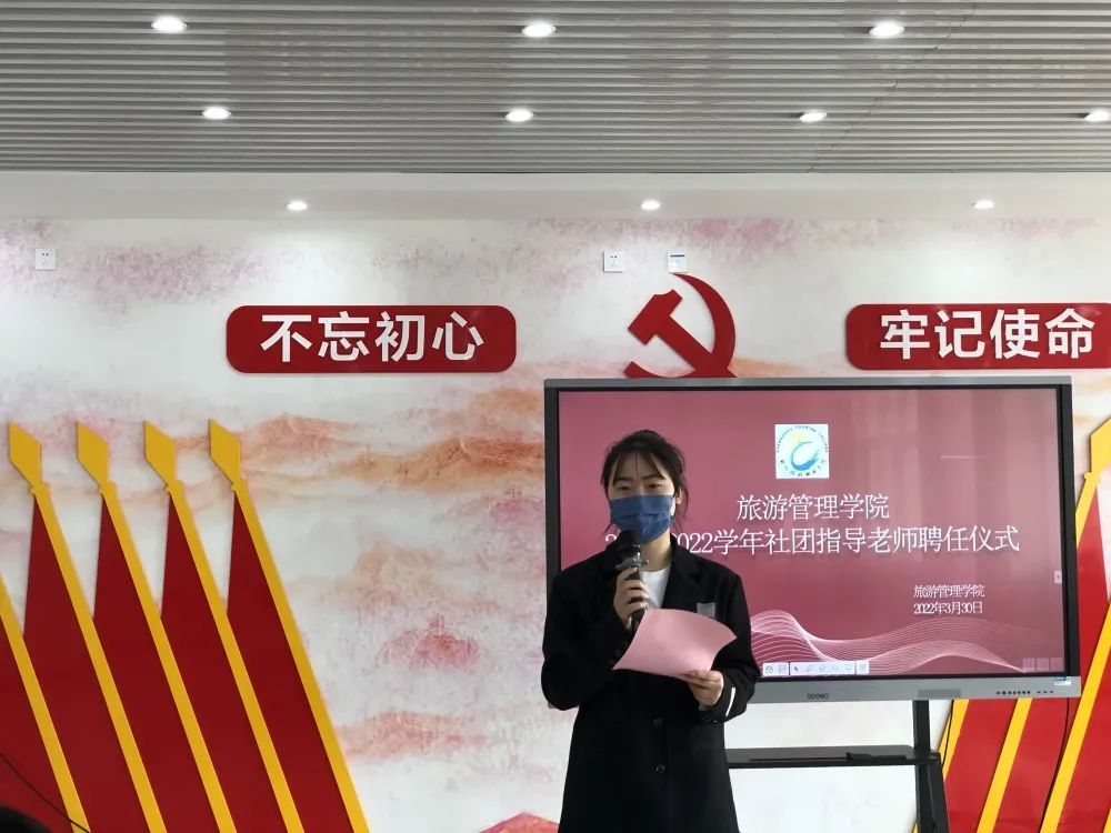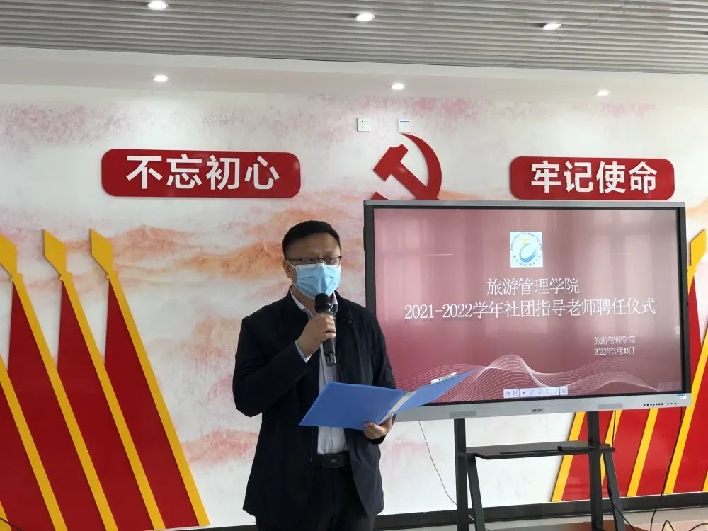 为深入贯彻落实习近平新时代中国特色社会主义思想,特别是习近平总书记关于高校思想政治工作和青年工作的重要论述,全面推进学生社团工作有序发展,充分发挥学生社团育人工作,强化学生社团管理。旅游管理学院于2022年3月30日,在5号教学楼a栋党建馆举行旅游管理学院2021-2022学年社团指导老师聘任仪式,会议由夏菁同学主持。
