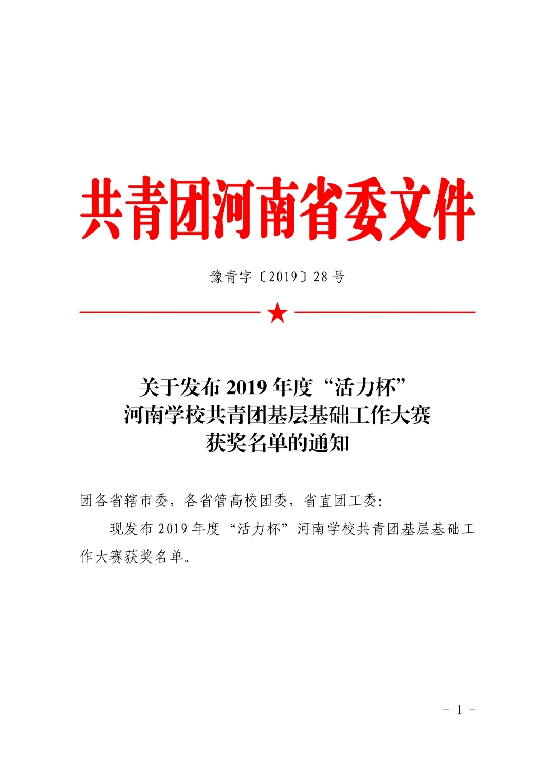在2019 年度“活力杯”河南学校共青团基层基础工作大赛中,我院一举斩获以下个人及团体奖项(获奖名单详见附件)。