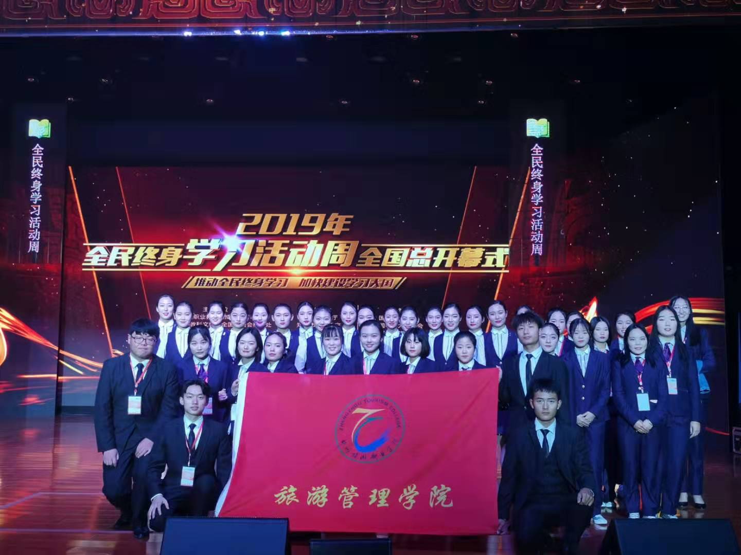 2019年11月8日上午8时,旅游管理系18级导游一班张亚欣、导游三班朱幸绅、旅行社班乔妞、高旅五班冯软玲等共20名优秀学生参与由教育部职业教育与成人教育司、中国联合国教科文组织全国委员会秘书处、中国成人教育协会主办,河南省教育厅及郑州市人民政府承办的2019年全民终身学习活动周全国总开幕式的讲解工作。2019年全民终身学习活动周以“推动全民终身学习,加快建设学习大国”为主题,全国总开幕式将于11月8日在郑州市第五十四中学举办。