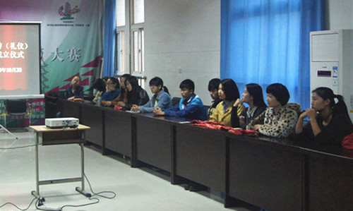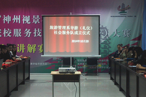 旅游管理系于2014年10月20日下午16:20在我院西教学楼四楼会议室举行导游(礼仪)社会服务队成立仪式,我系党总支副书记张笃川、辅导员戚丁钒老师出席本次成立仪式。