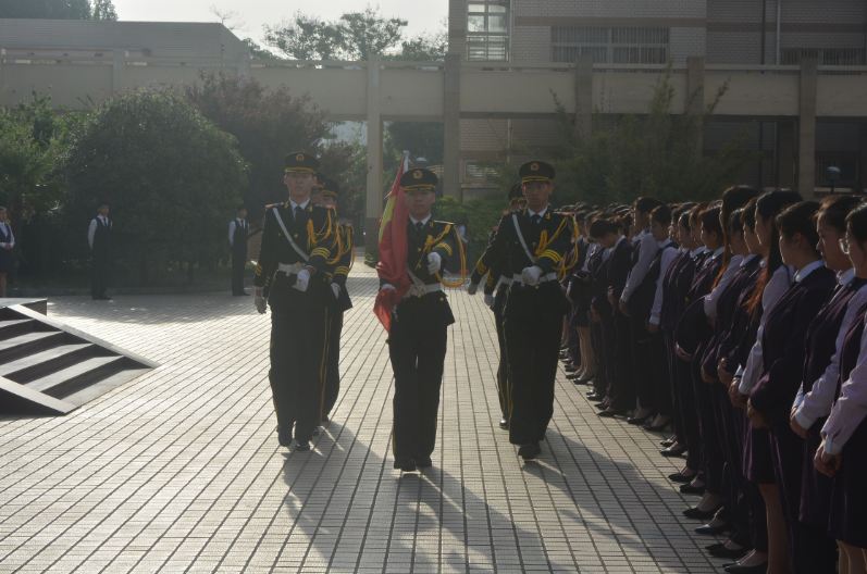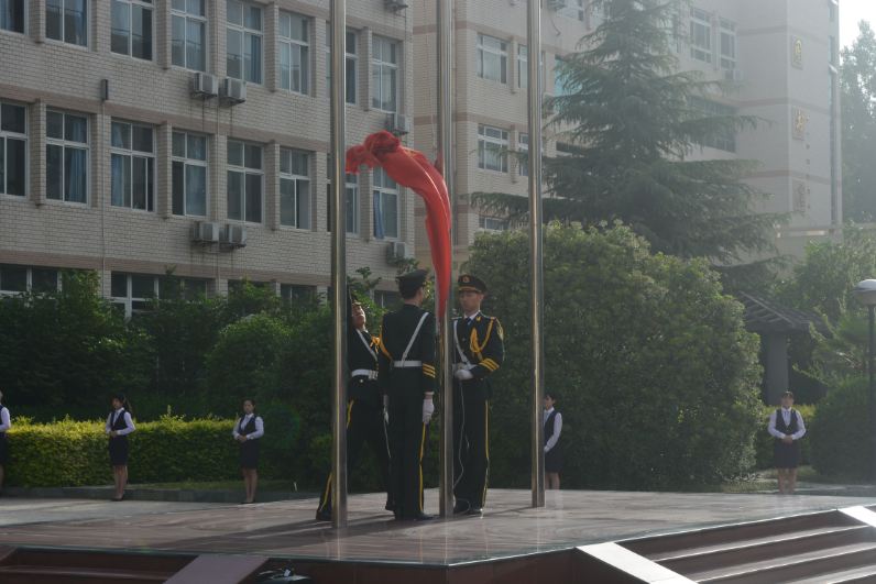 仪式开始,全体师生肃立,英姿飒爽的国旗护卫队队员护送鲜艳的五星红旗进场,伴随着庄严嘹亮的国歌,五星红旗冉冉升起。全体师生深怀对祖国无限热爱和崇高的敬意,对国旗行注目礼。