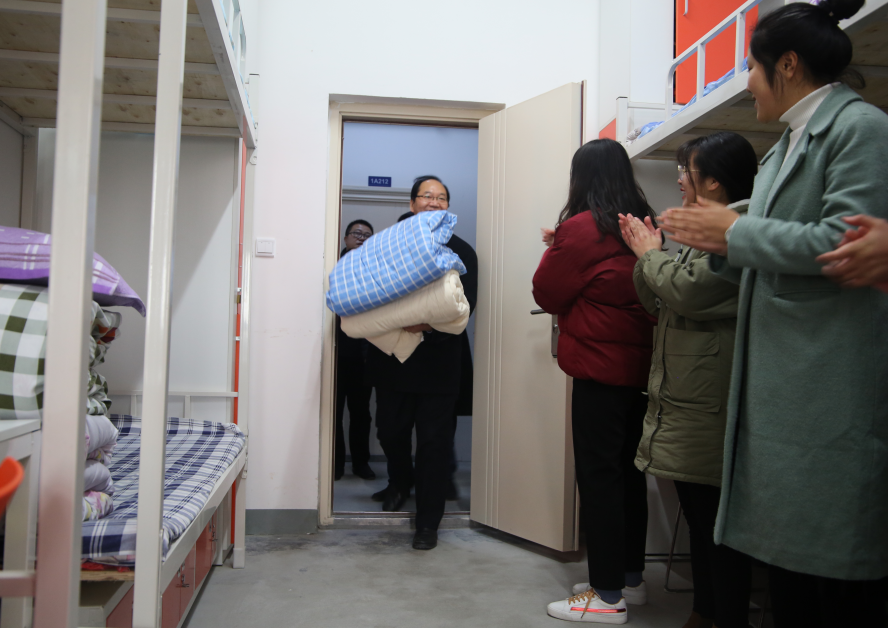 暖冬行动过程中,文院长在百忙之中莅临一线,亲自到我系学生宿舍,将棉被送到其中4位家庭经济困难学生手中,如冬日里的一抹暖阳,使学生充分感受到了学院的温暖和关爱。文院长与同学们亲切交谈,询问其家庭、学习及生活情况,对他们积极乐观的态度表示肯定,鼓励他们要趁年轻敢吃苦,加紧专业学习,掌握专业技能,在激情奋斗中绽放青春光芒。