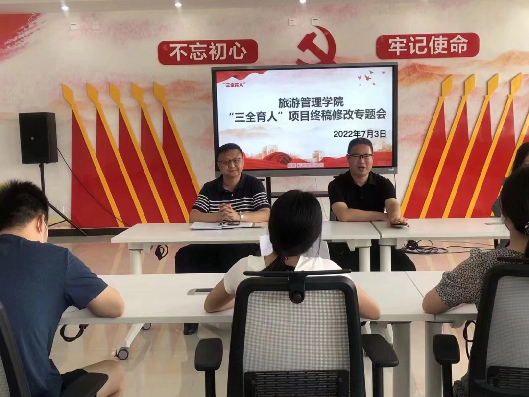 2022年7月3日,旅游管理学院“三全育人”项目终稿修改专题会在党建馆召开。学院党总支书记秦合岗,党总支副书记张楗让,各模块负责人参加会议。会议由张楗让主持。