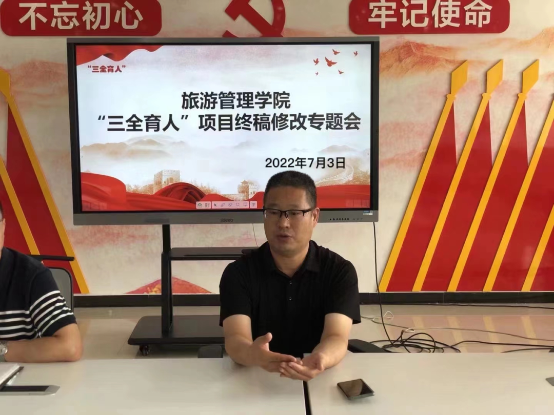 会议针对学院“三全育人”项目终稿——《中共郑州旅游职业学院委员会旅游管理学院“三全育人”综合改革试点工作总结报告》,坚持问题导向、目标导向、任务导向和结果导向,全面审视和梳理“三全育人”项目终稿内容的漏洞和缺失,致力于高度凝练可复制、可推广、可借鉴的成果,形成“三全育人”综合改革工作的旅管经验。