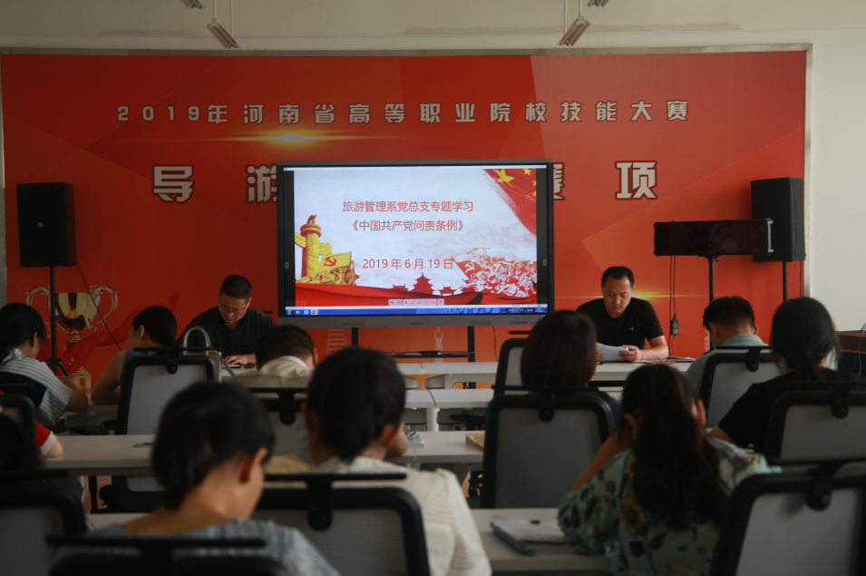 6月19日下午两点半,旅游管理系在5号楼A座四楼会议室召开集中学习《中国共产党问责条例》专题会议。副主任张东月、秦合岗,党总支副书记张笃川以及全体教职工参与会议。会议由张笃川主持。