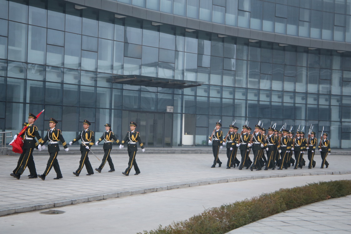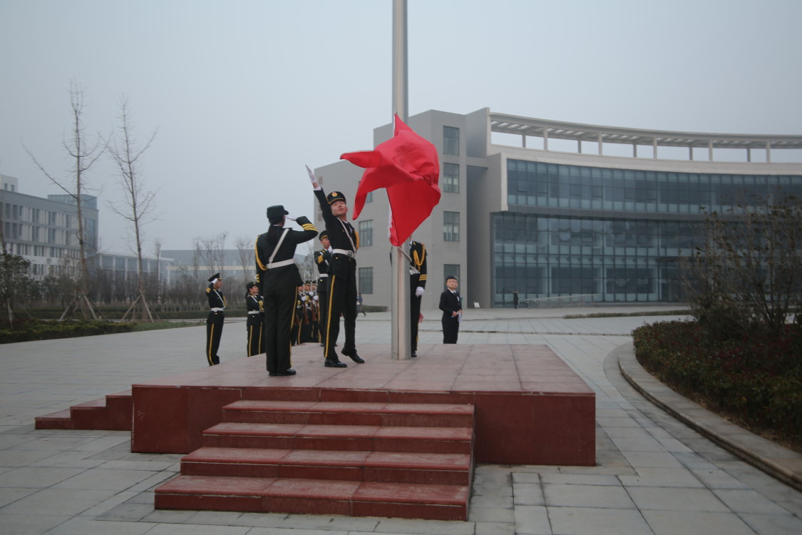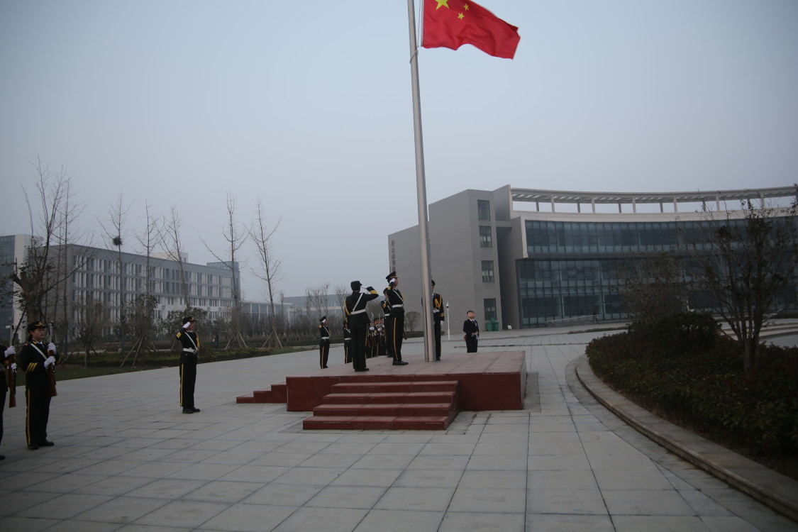 升旗仪式开始,国旗护卫队列着整齐的队伍,踏着铿锵有力的正步护送着鲜艳的五星红旗走向升旗台,伴随着慷慨激昂的《义勇军进行曲》,五星红旗缓缓升起,全体师生行注目礼。