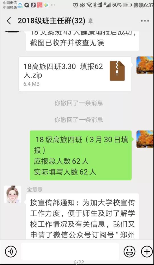 我所在带的18级高旅四班共62名学生,其中郑州13人,信南周驻商15人,省外5人,所以每天早上第一件事就是查看学生移动情况,督促同学们健康打卡,跟同学们聊天,贯彻国家和学校的要求。
