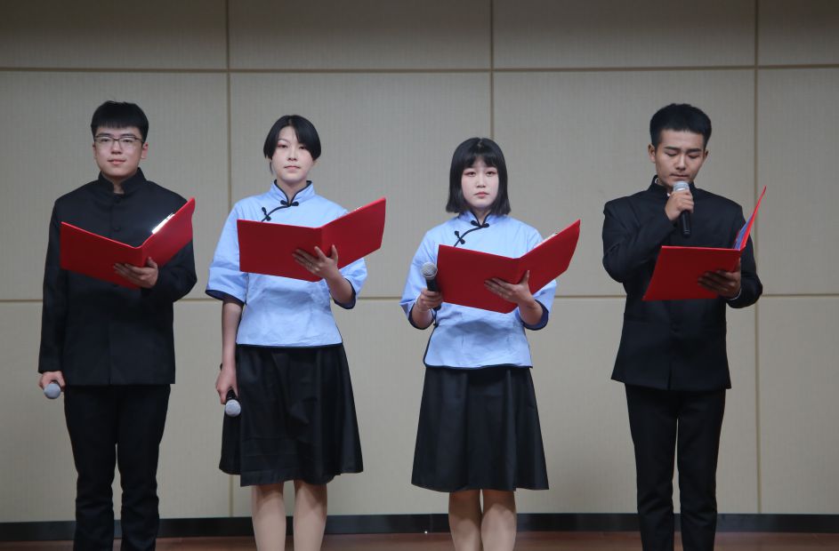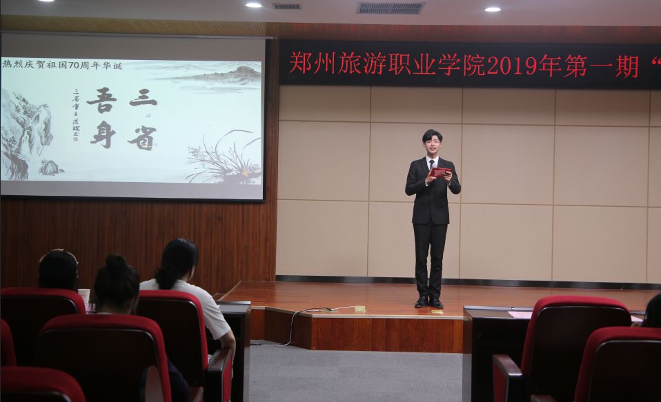 活动在一段舒缓悠扬的音乐中拉开帷幕,引领大家深刻自省,心存善念,真诚待人,牢记先修身,才能齐家、治国、平天下,用心感受生活中点点滴滴的善言善行,给自己、给家庭、给社会带来的平安、幸福、吉祥。一首《歌唱祖国》,唱出我们对祖国的热爱,表达了我们作为中华儿女,将不只是把爱国停留在口号上,更是把我们自己的理想同祖国的前途、民族的命运紧密联系在一起!为给学生照亮前行的路,我系特邀优秀毕业生代表河南建业新生活旅游服务有限公司高级客户经理员欣学姐为大家分享她的经验和感悟,以自身经历告诫大家,年轻就要多尝试、努力,面对挫折,不要气馁,要坚守自己的初心,不辱使命,不负期望。诗歌朗诵《我的南方和北方》,更是激起了大家深深的爱国情怀和优越的民族自豪感。